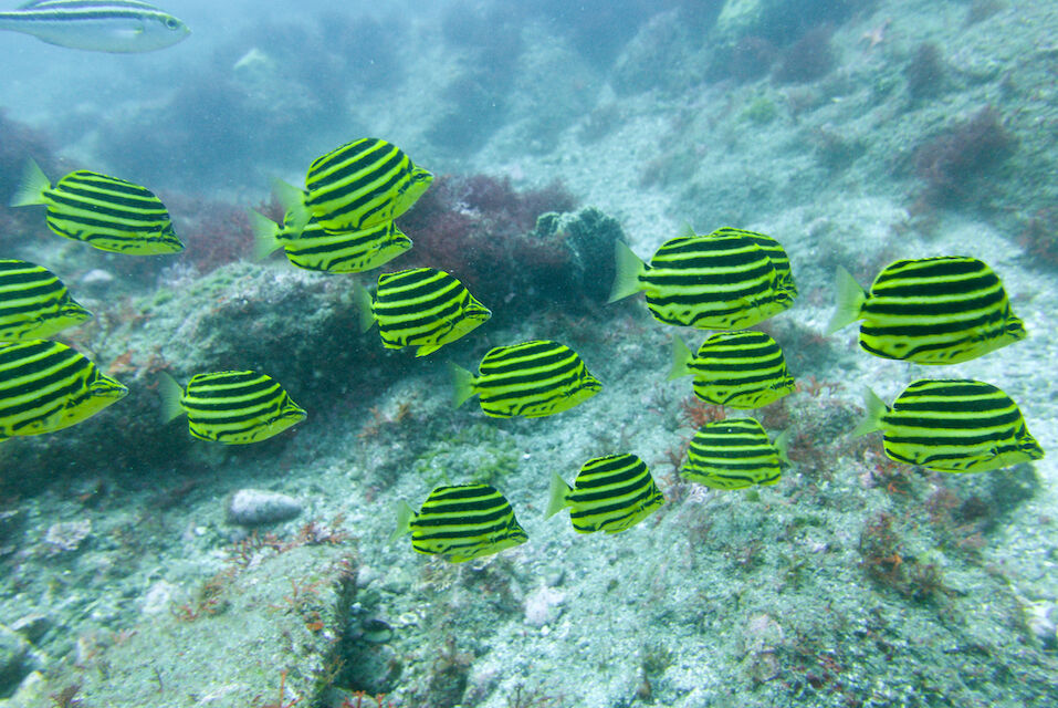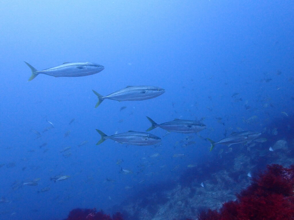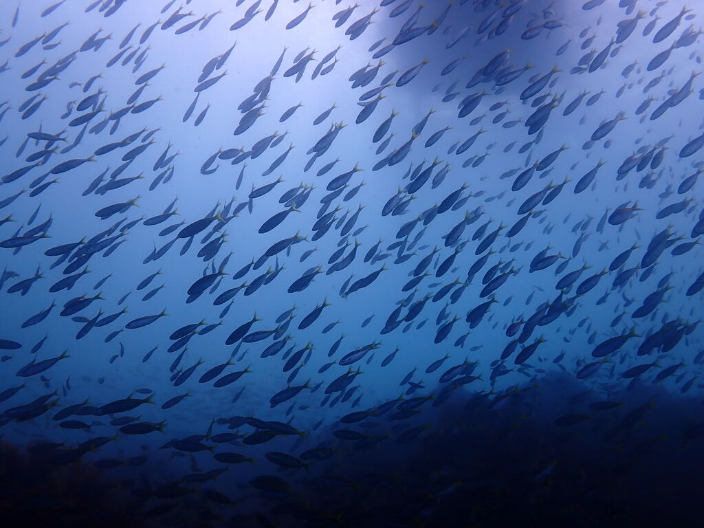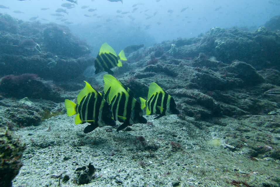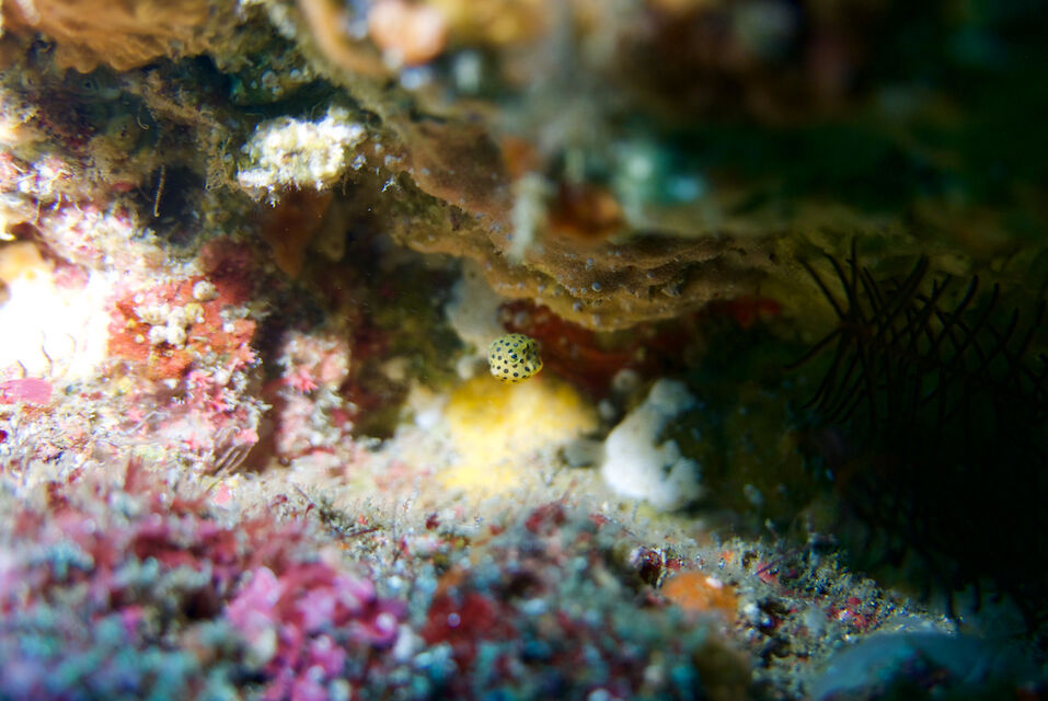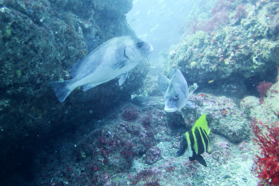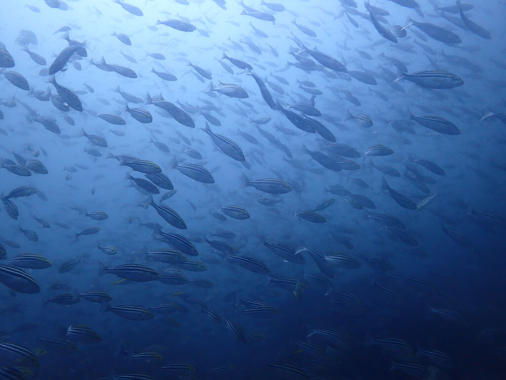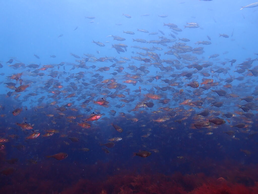 ミナミハコフグの幼魚3匹、メジナ、イサキの群れ、ミツボシクロスズメダイなど。