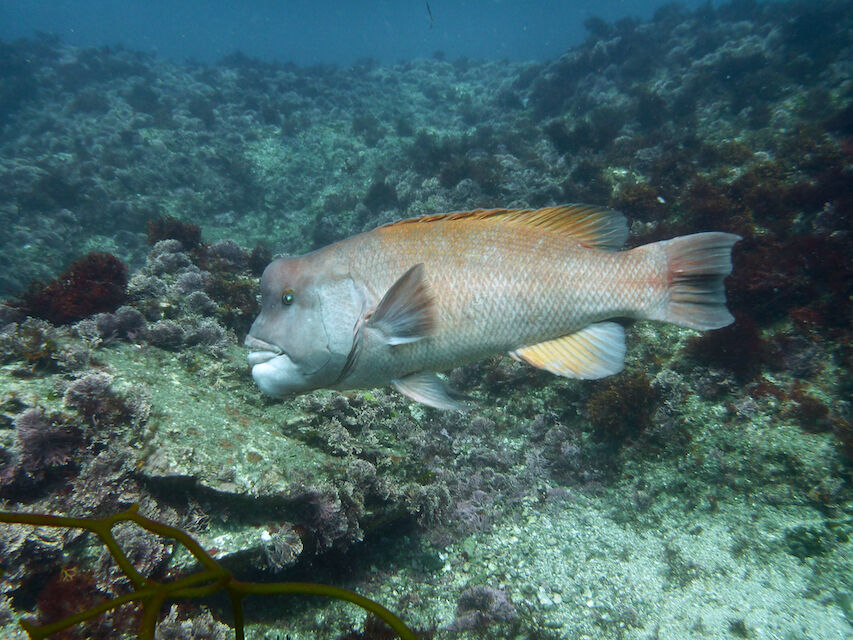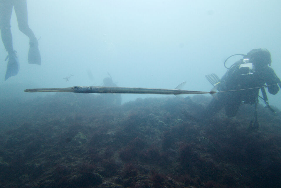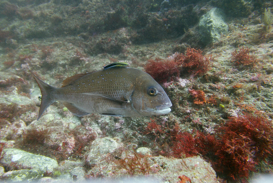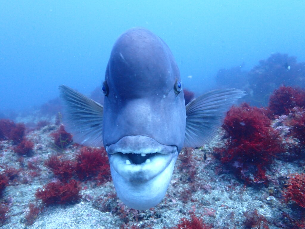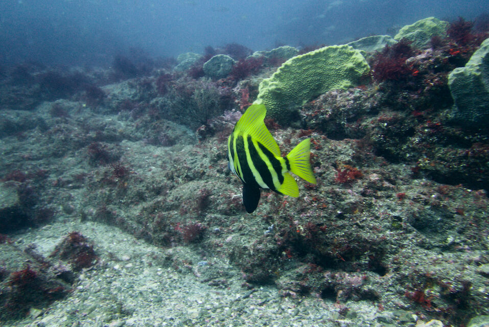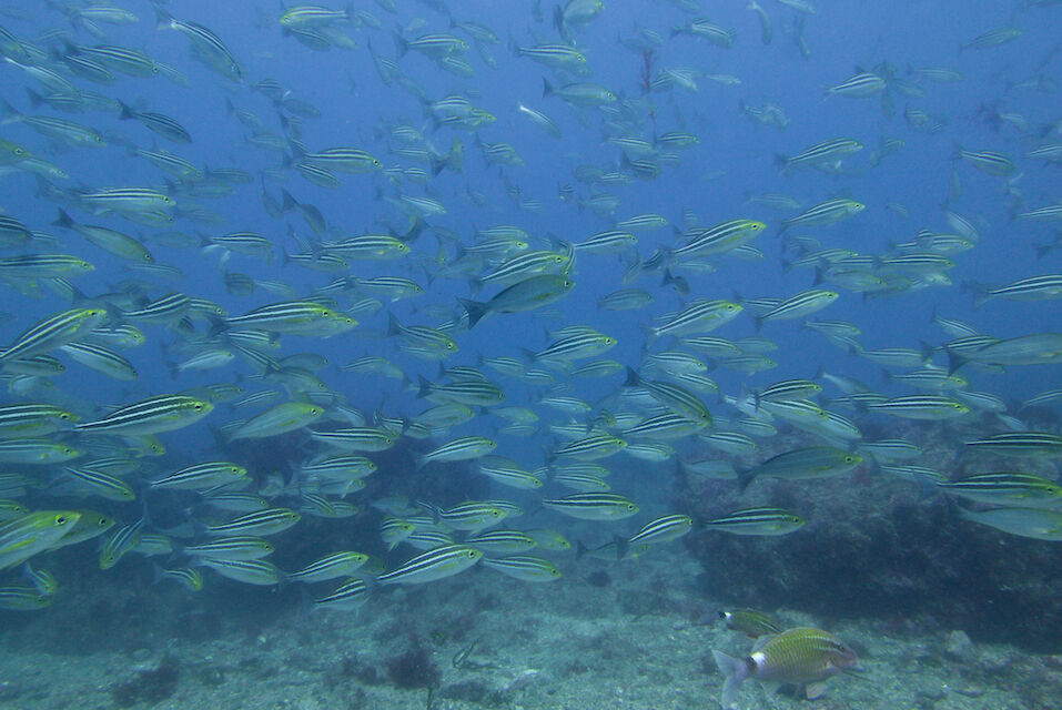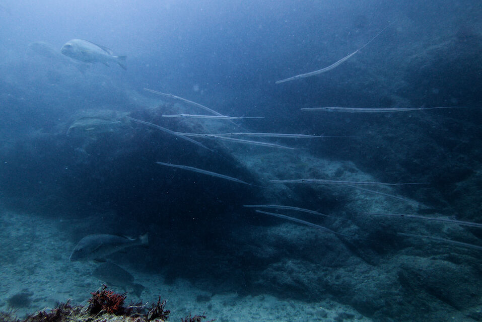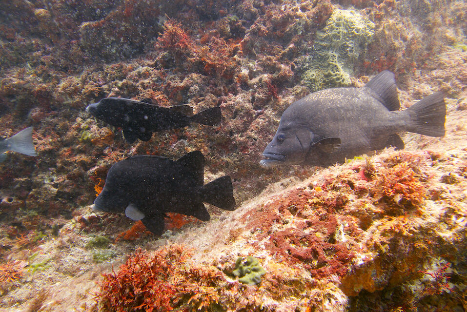 ミナミハコフグの幼魚3匹、メジナ、イサキの群れ、ミツボシクロスズメダイなど。
