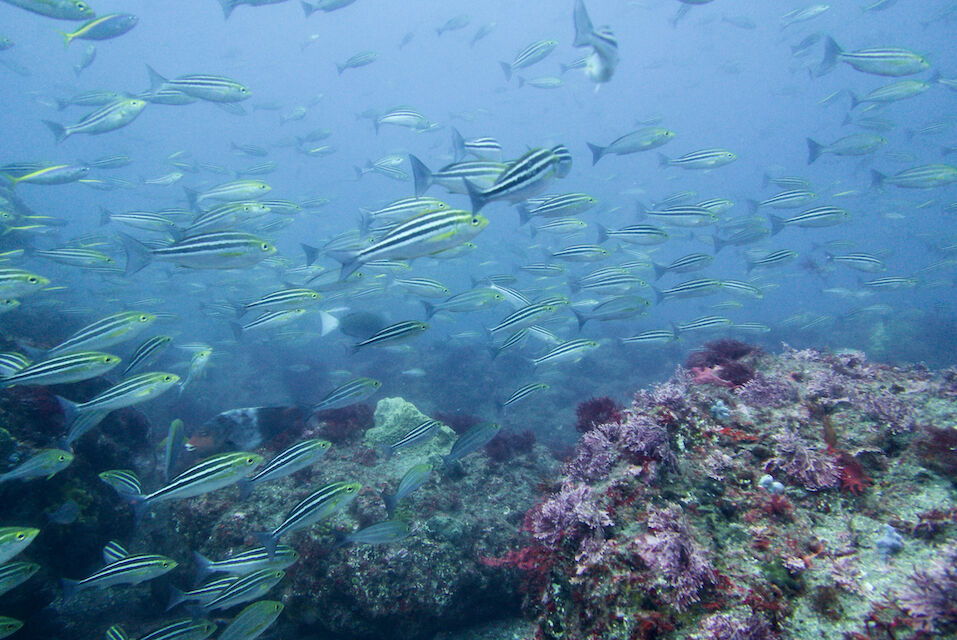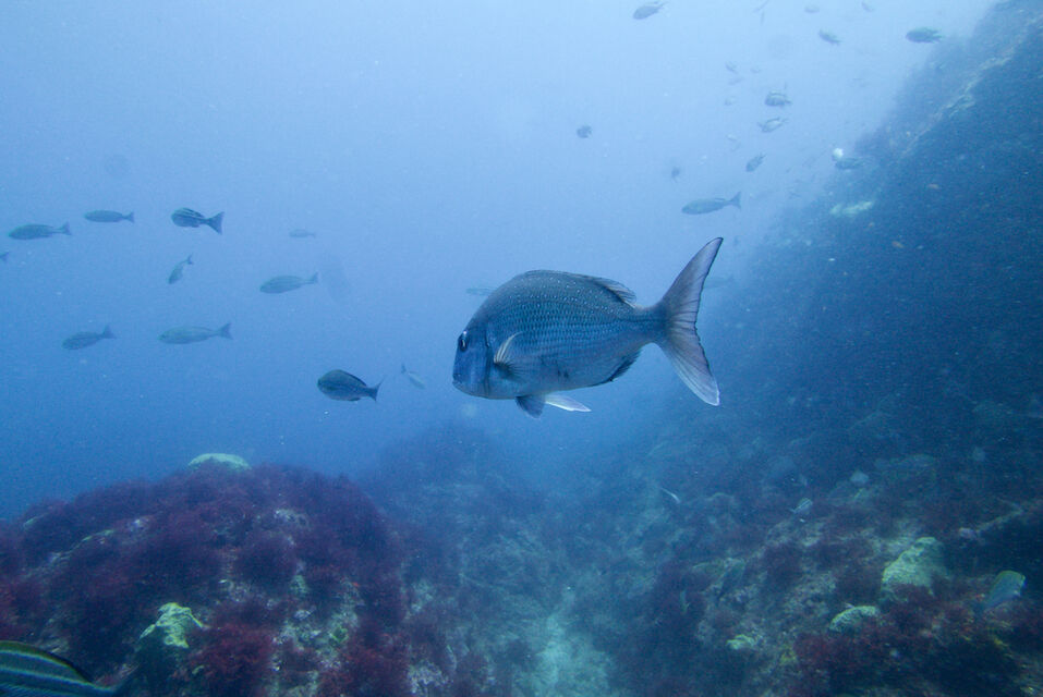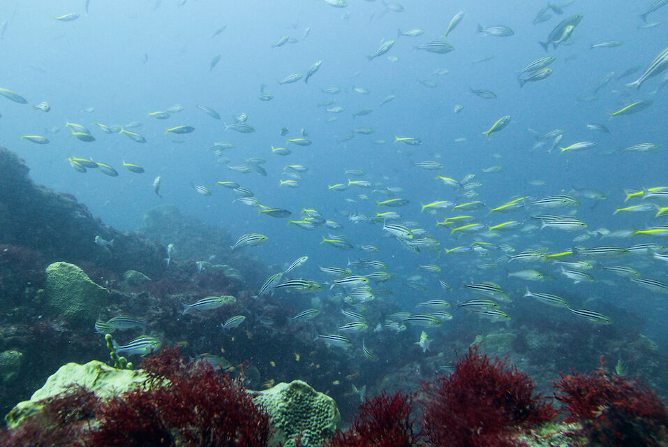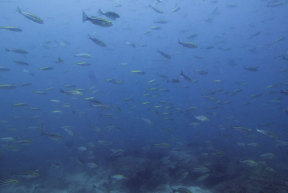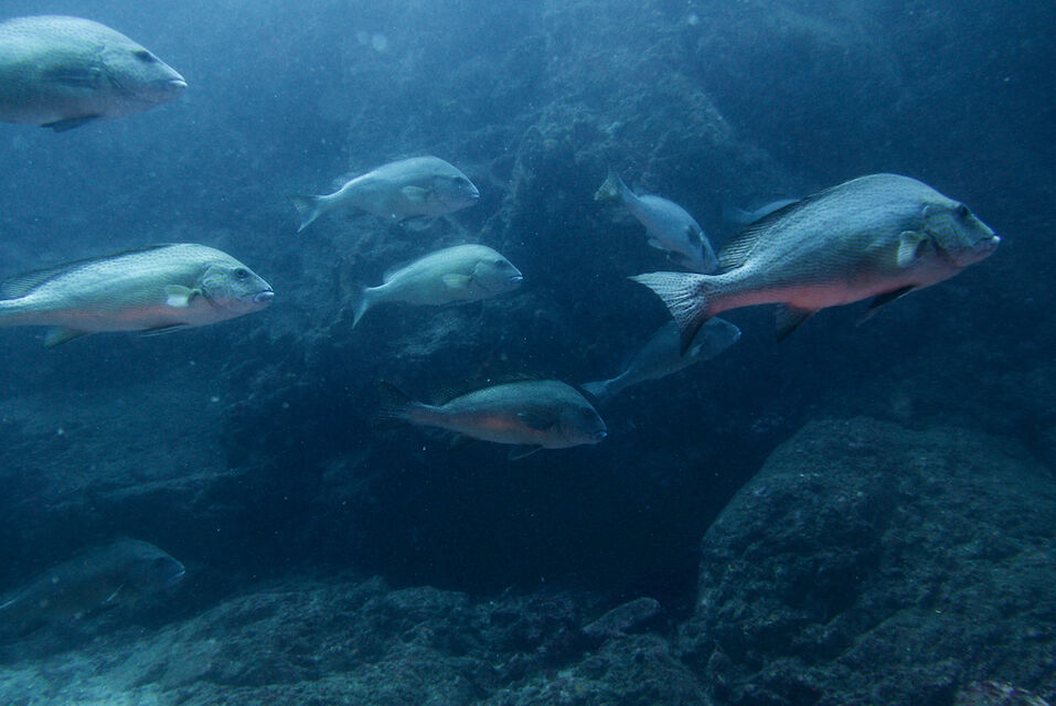 イサキの群れ、マダイ。黄色いオオモンカエルアンコウ。