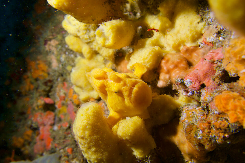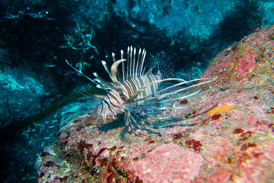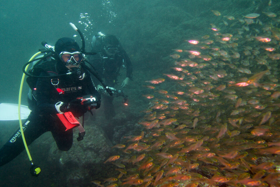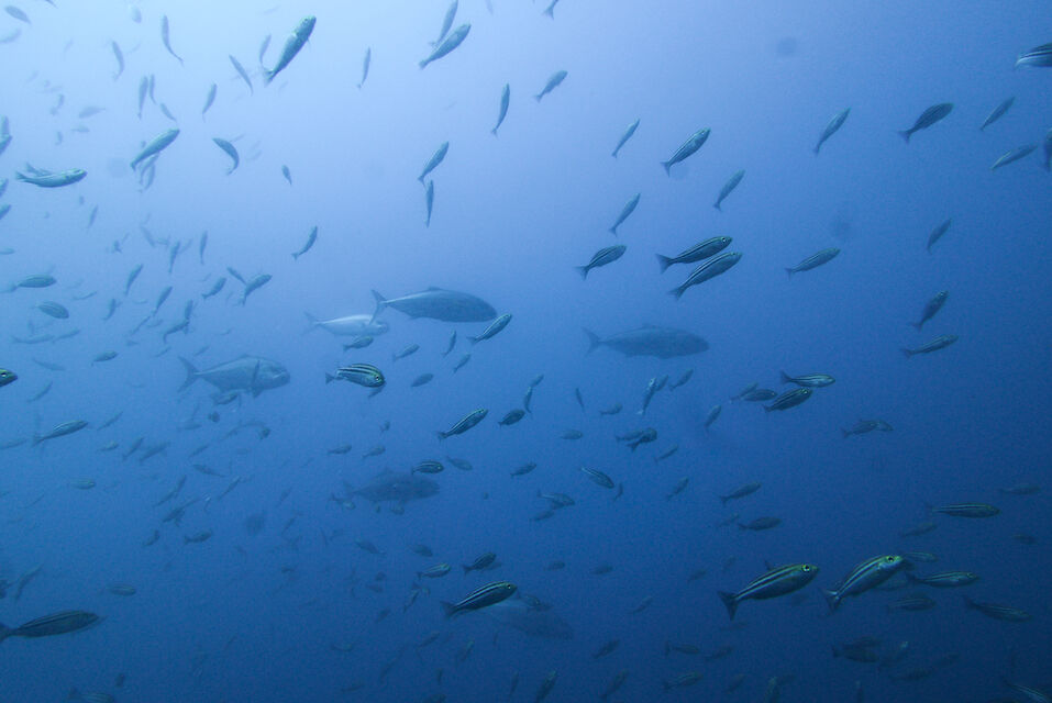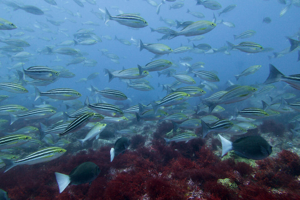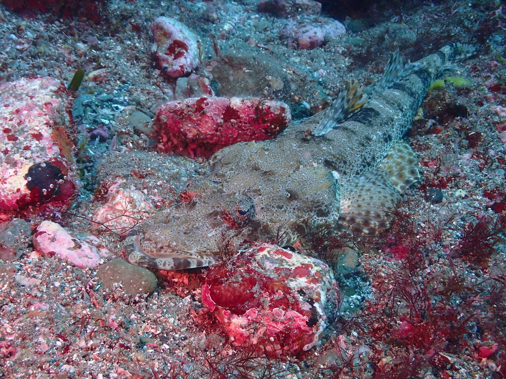 イサキの群れ、マダイ。黄色いオオモンカエルアンコウ。