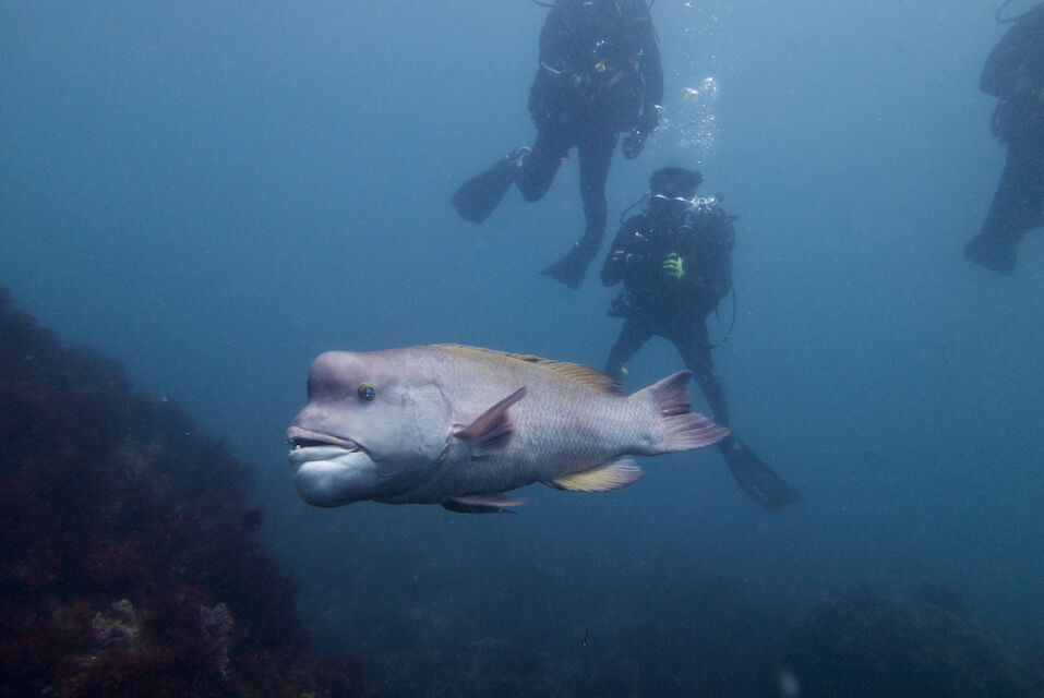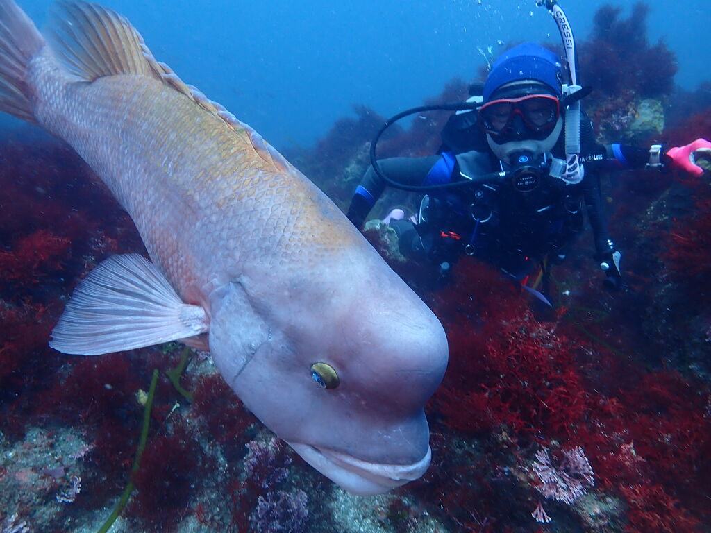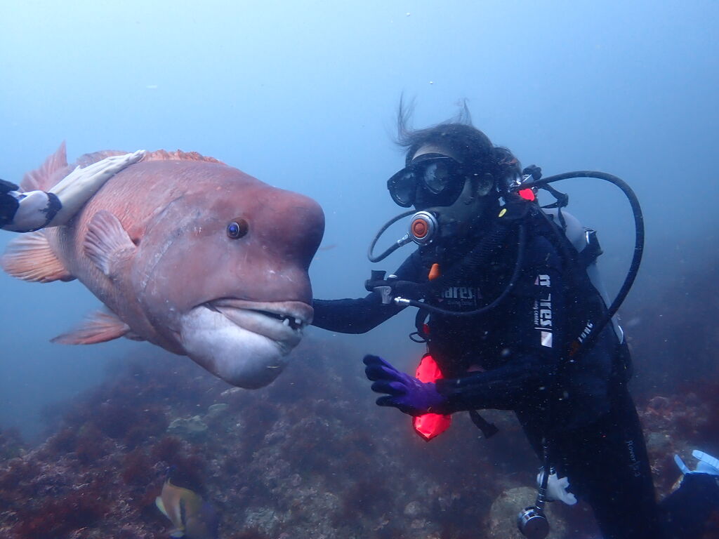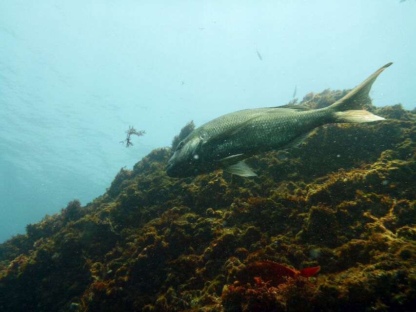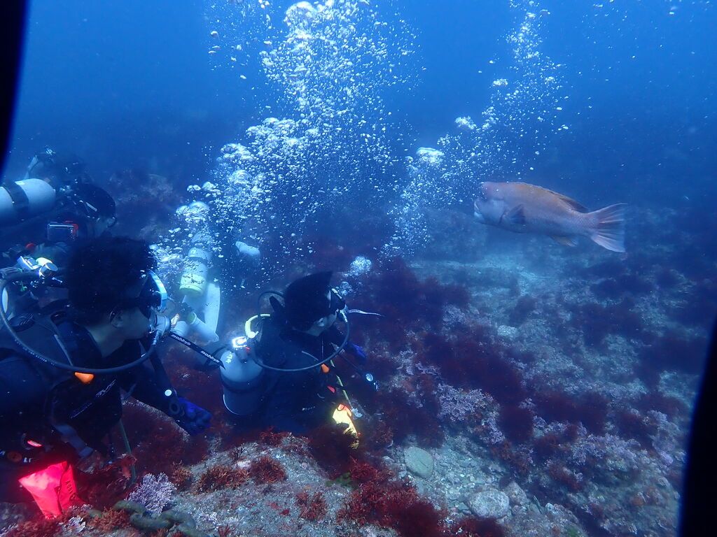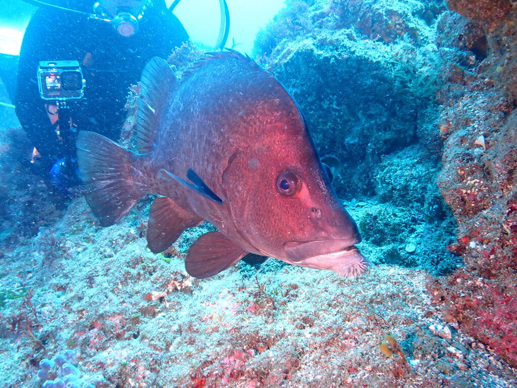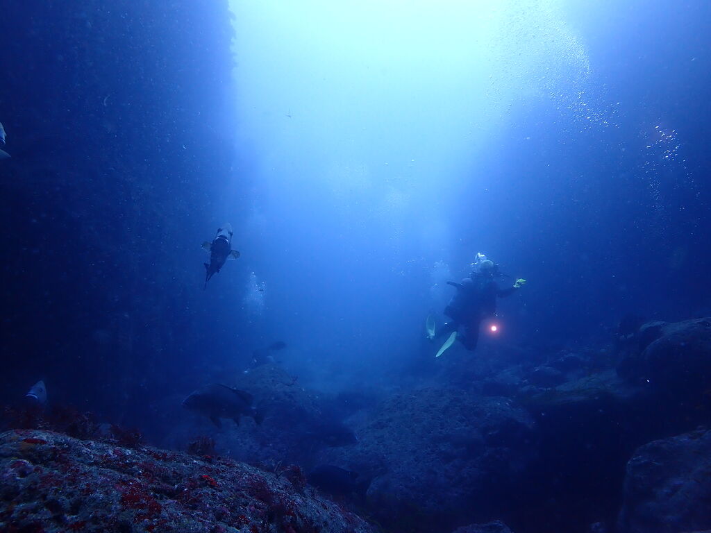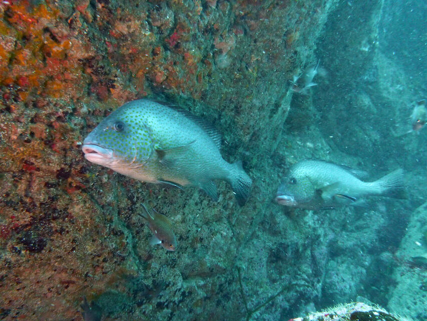 岩陰にはクエ。イサキとタカベの群れが濃い。