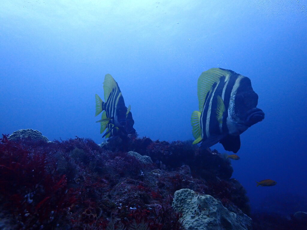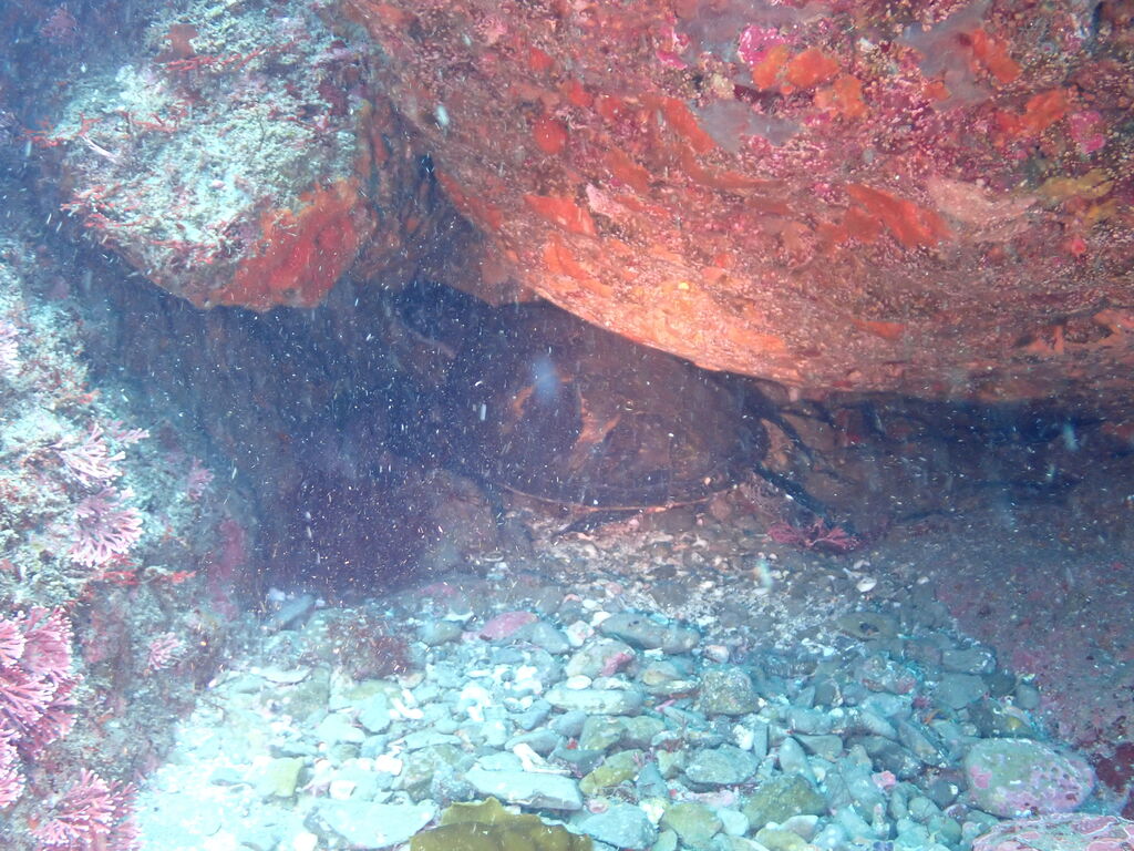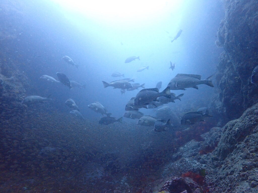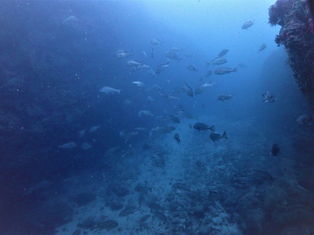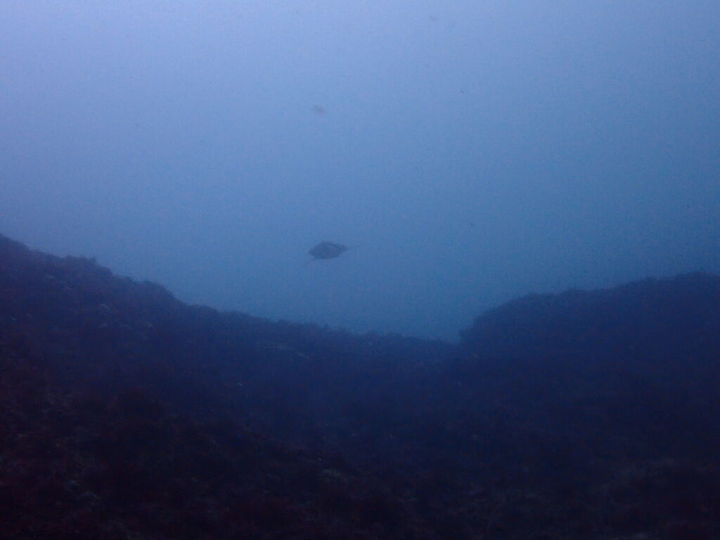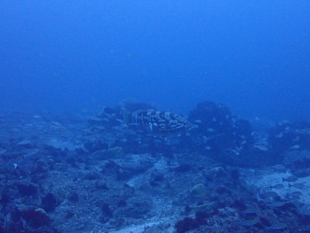 イサキの群れが濃い場所へ。イサキの群れに、テングダイが2匹、大きなヒゲダイと油断していると背後にイナダの群れ。イナダの群れが去ると今度はヒラマサ。 移動してクエ、クエを追って西側に出るとまたアオウミガメが泳いでいました。