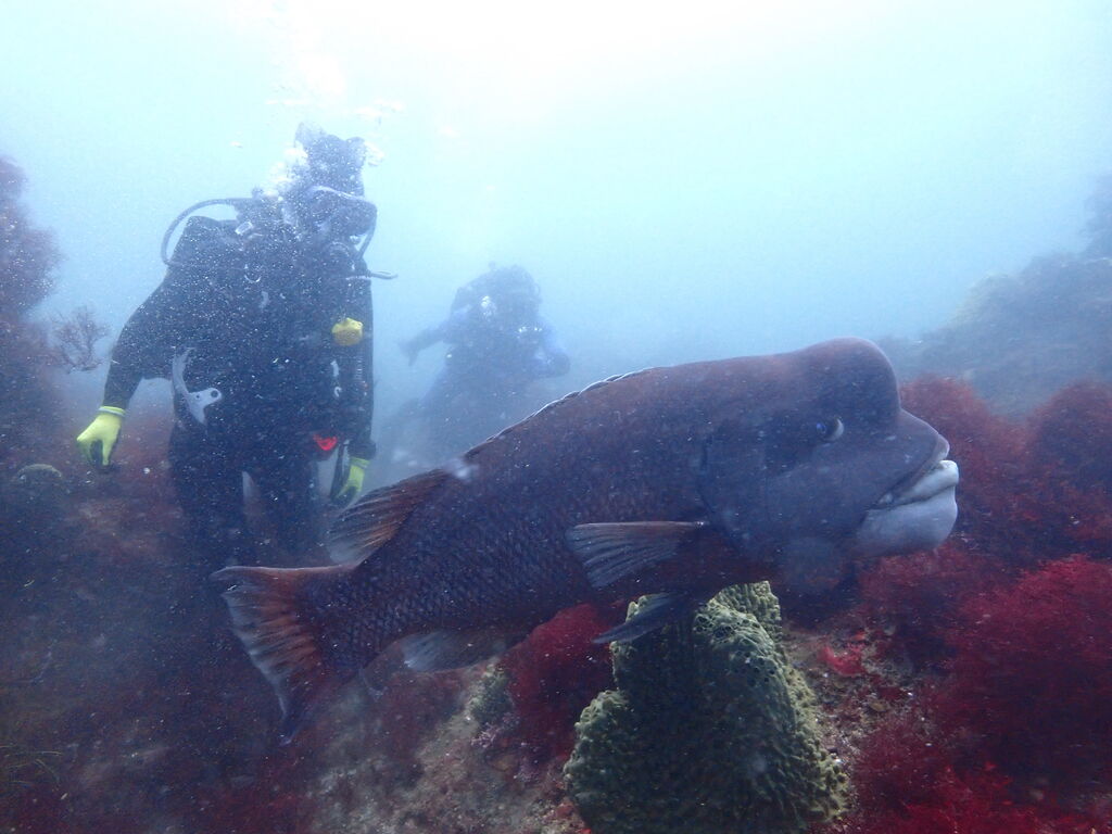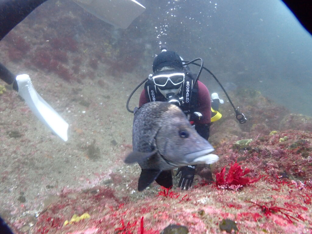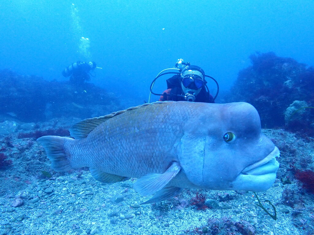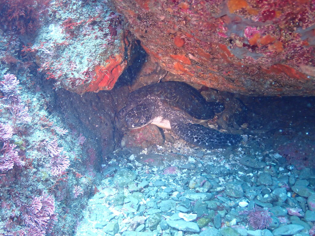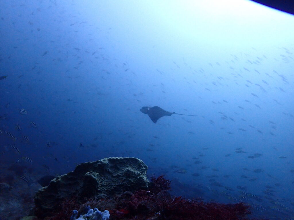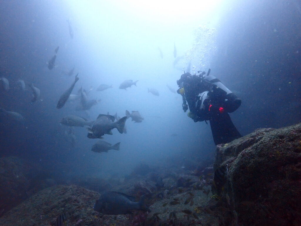 イサキの群れが濃い場所へ。イサキの群れに、テングダイが2匹、大きなヒゲダイと油断していると背後にイナダの群れ。イナダの群れが去ると今度はヒラマサ。 移動してクエ、クエを追って西側に出るとまたアオウミガメが泳いでいました。