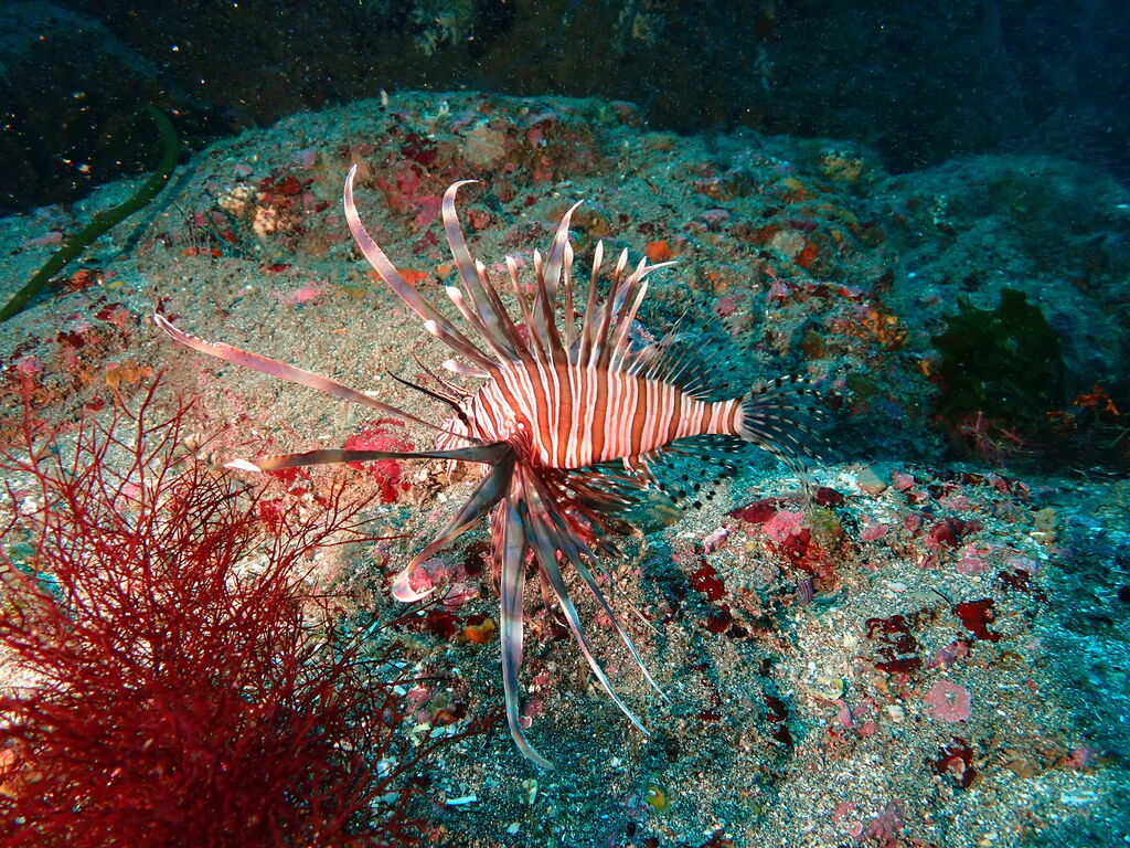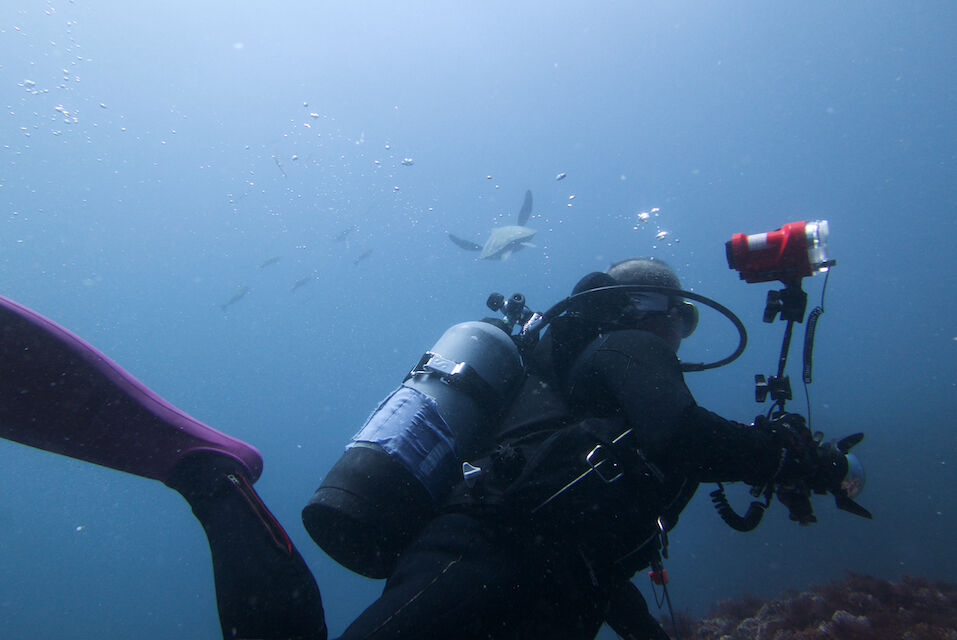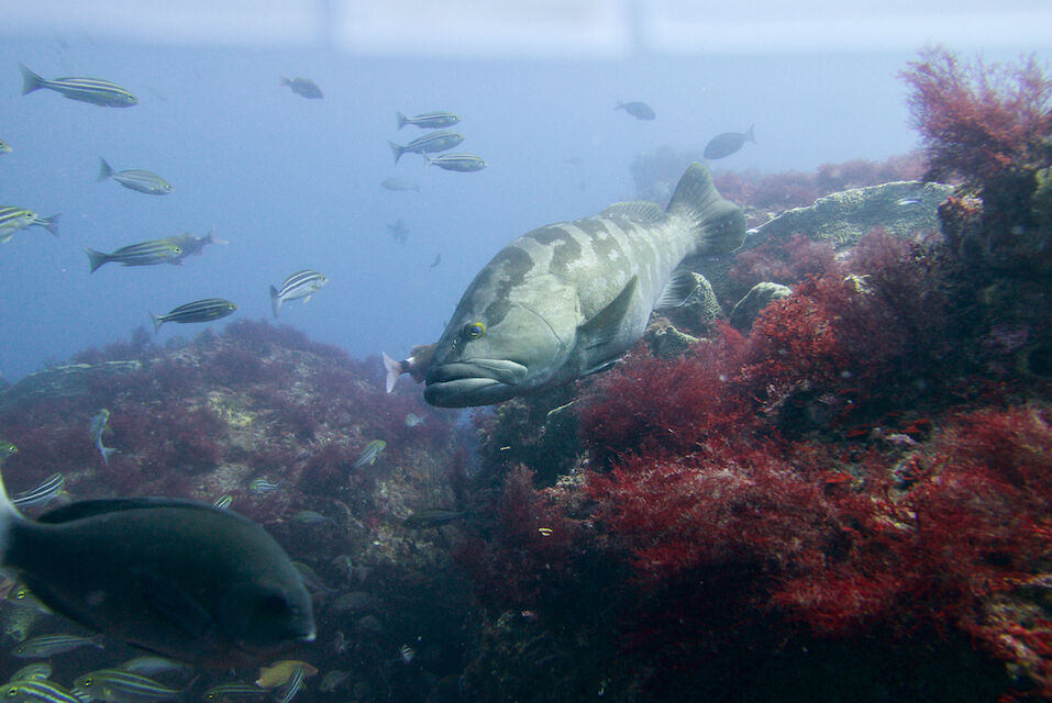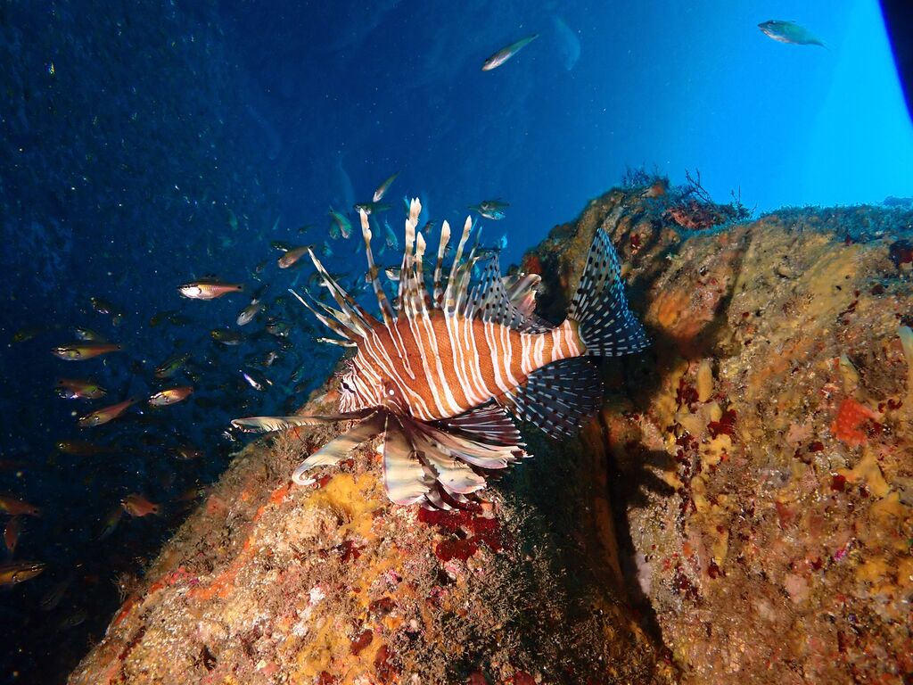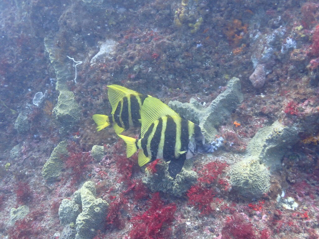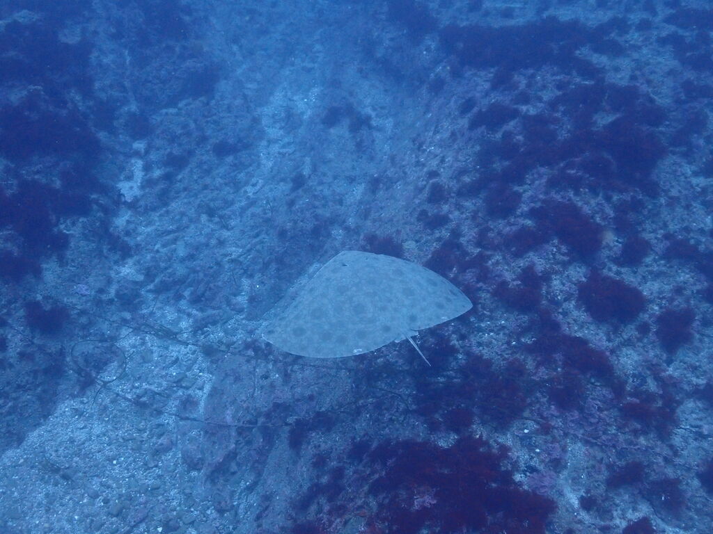 イサキの群れが濃い場所へ。イサキの群れに、テングダイが2匹、大きなヒゲダイと油断していると背後にイナダの群れ。イナダの群れが去ると今度はヒラマサ。 移動してクエ、クエを追って西側に出るとまたアオウミガメが泳いでいました。