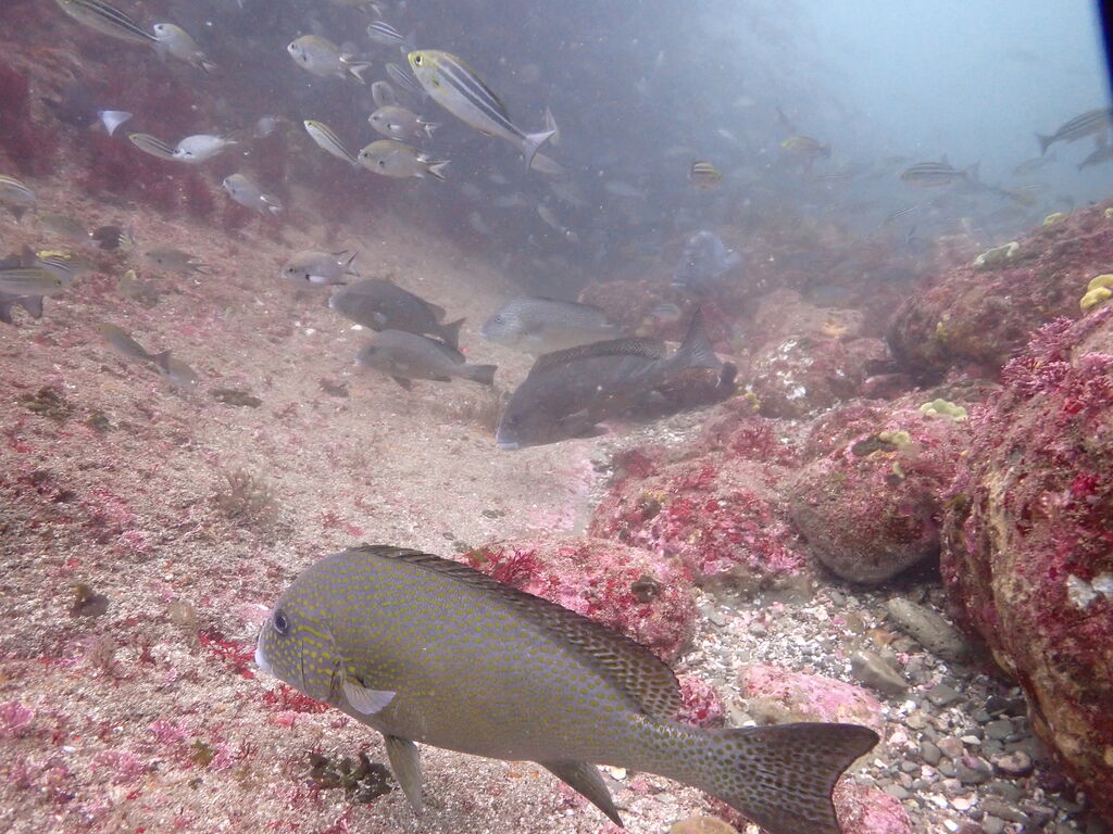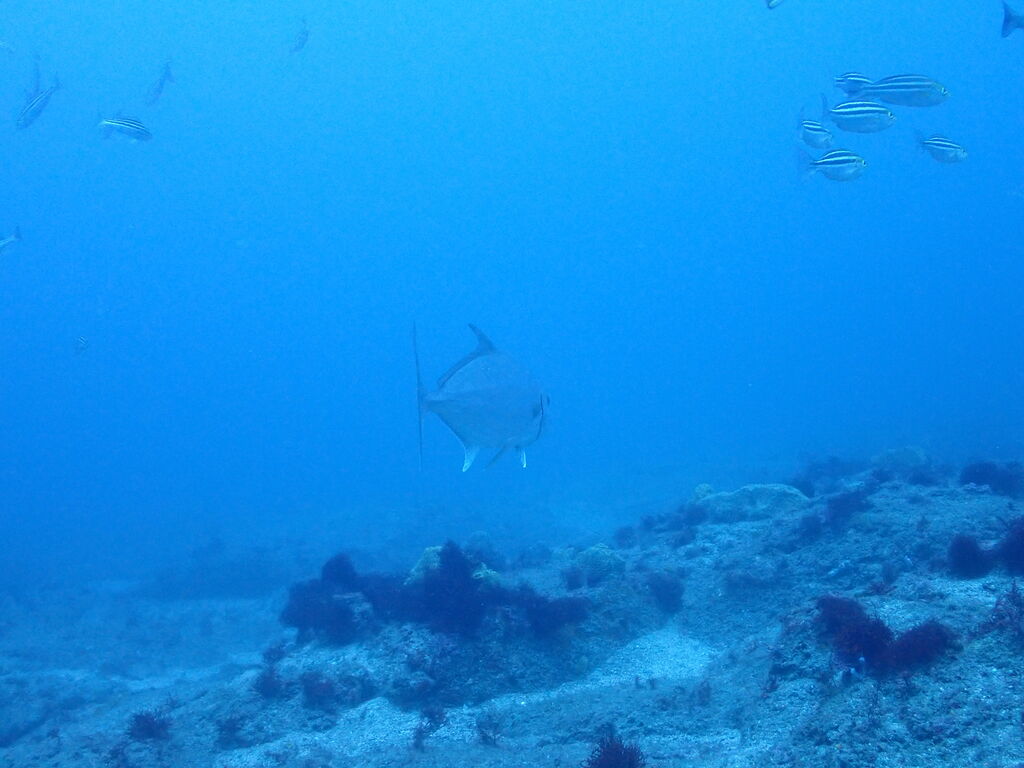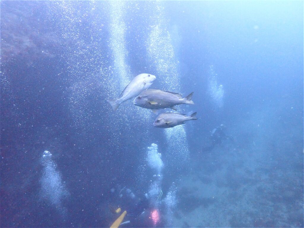 潮の影にテングダイが一匹。イサキの群れ、タカベの群れ。