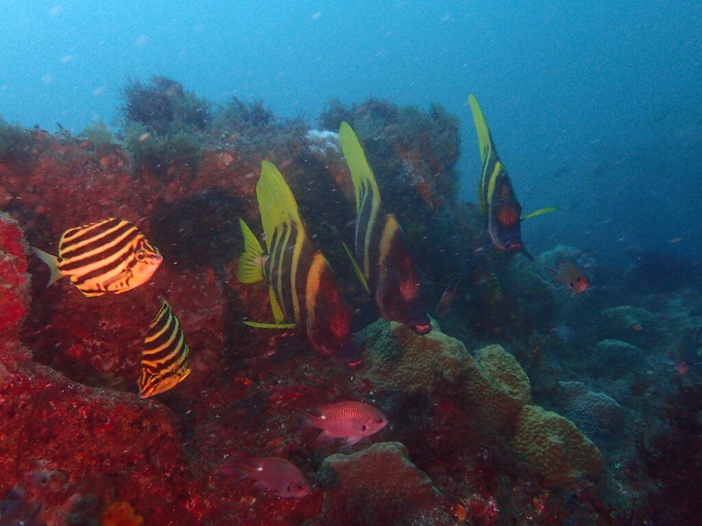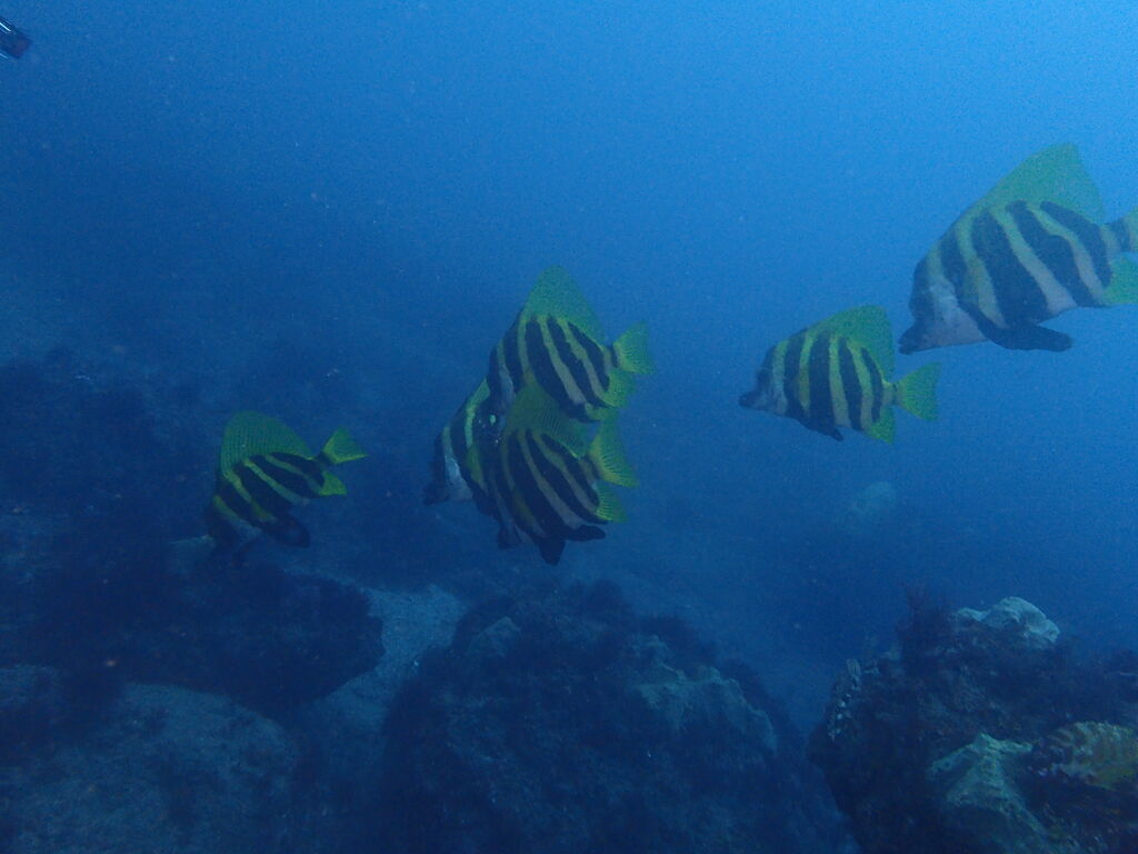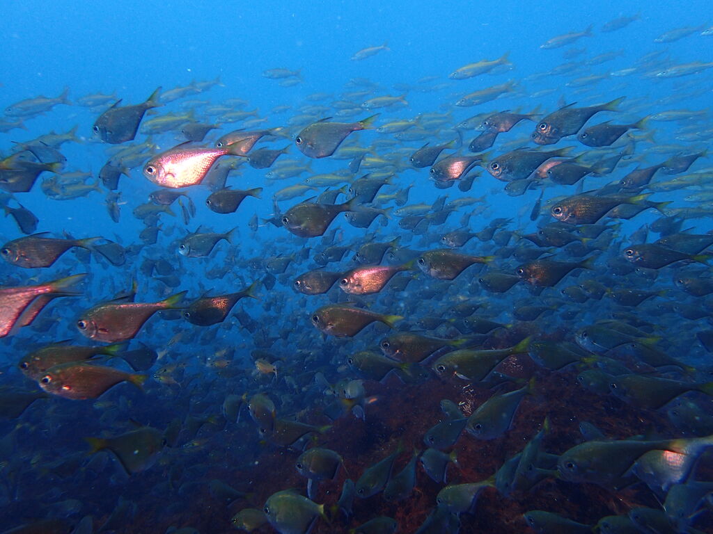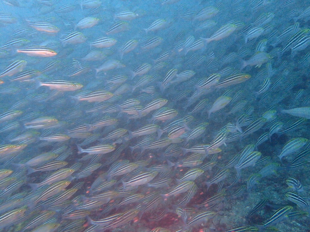 メイチダイの群れが根の上で固まっていました。