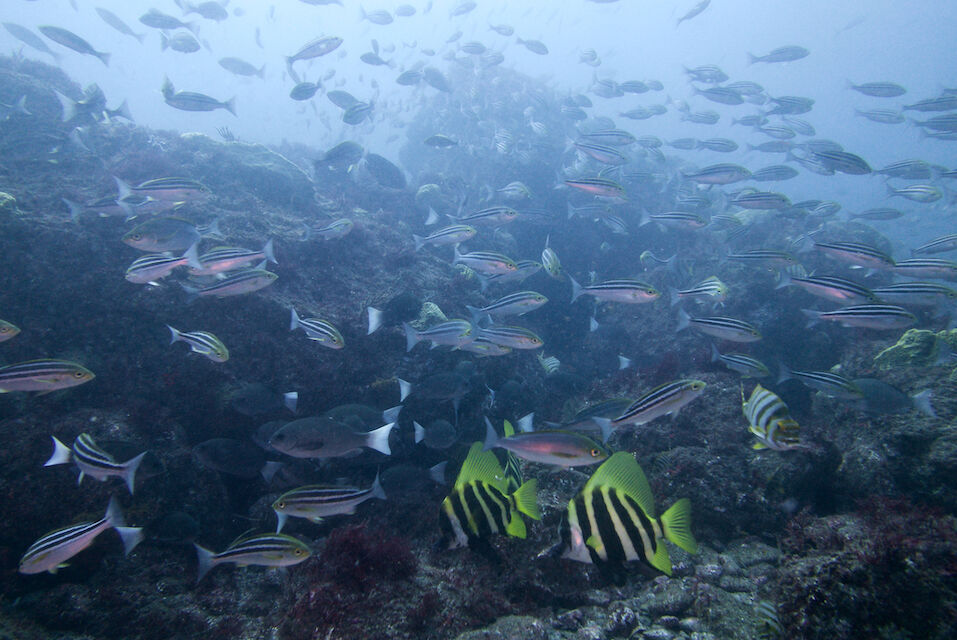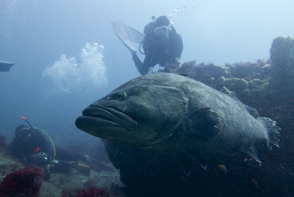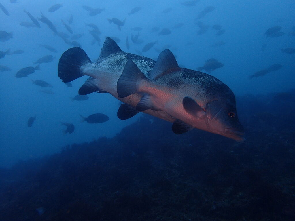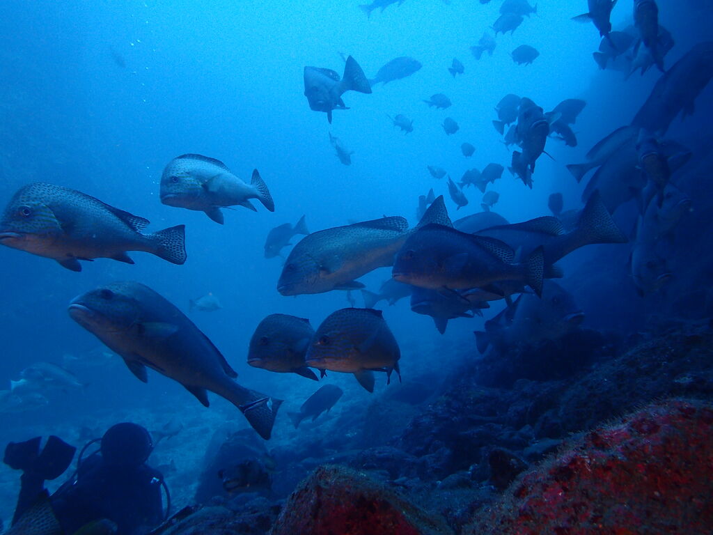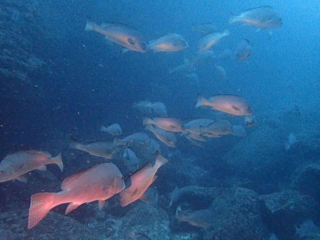 イサキとメイチダイの群れ。マダイの群れ。クエが何匹も。
