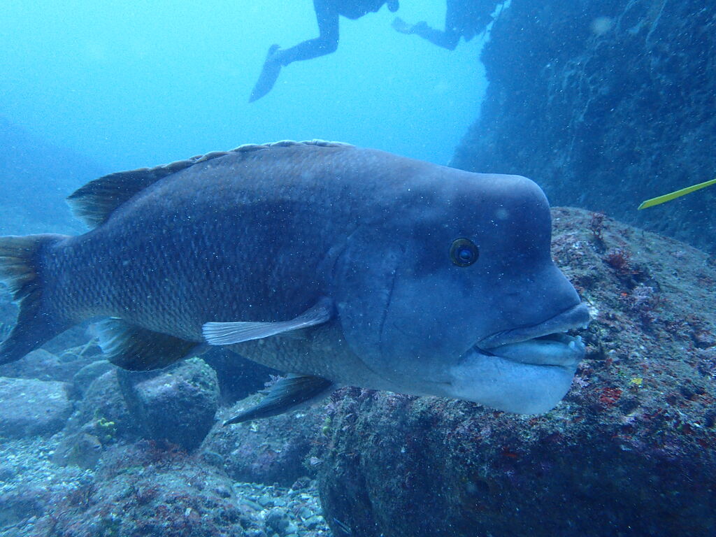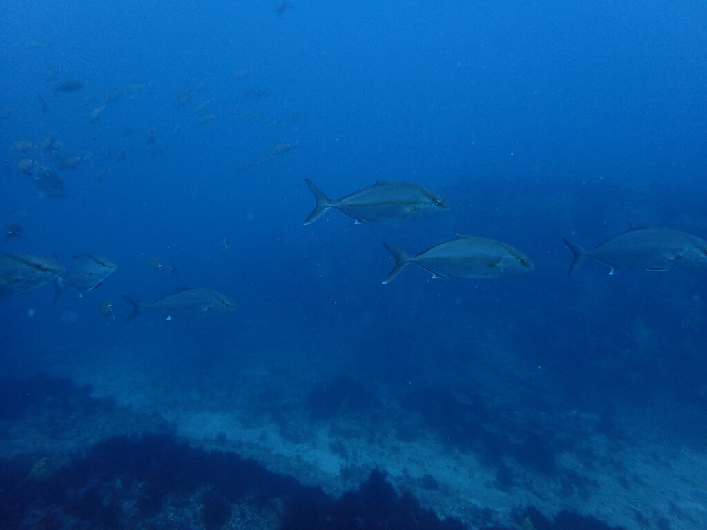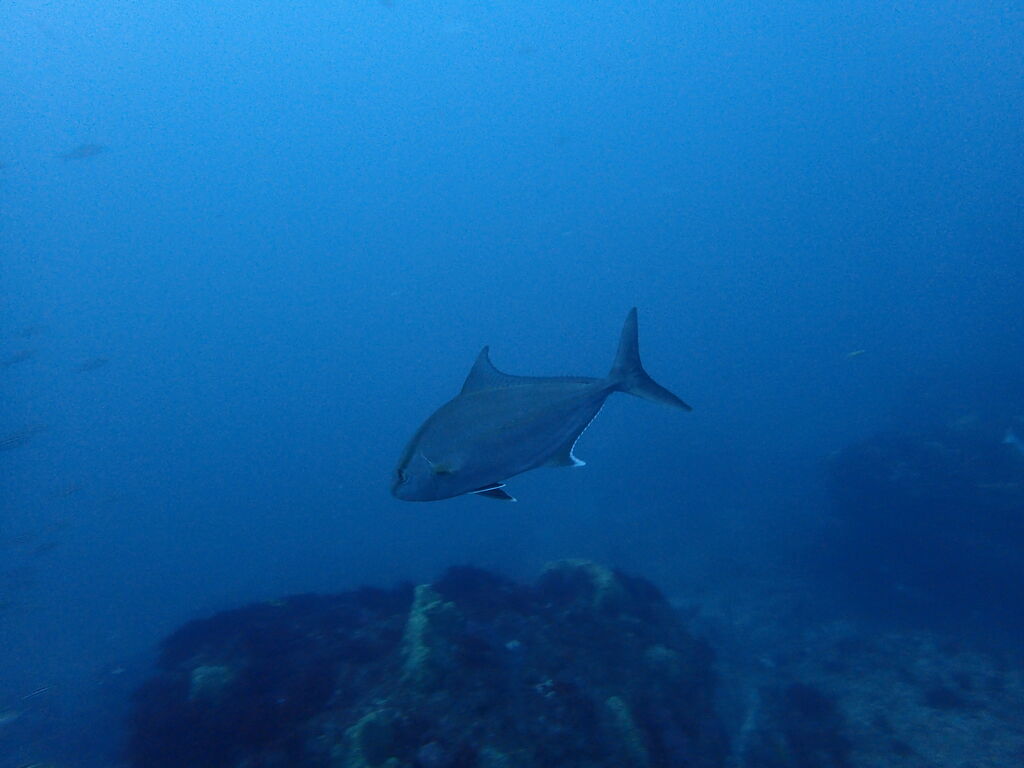 水底にヒゲダイ。上の方にイサキの群れ。その中をヒレナガカンパチが一匹まわっていました。