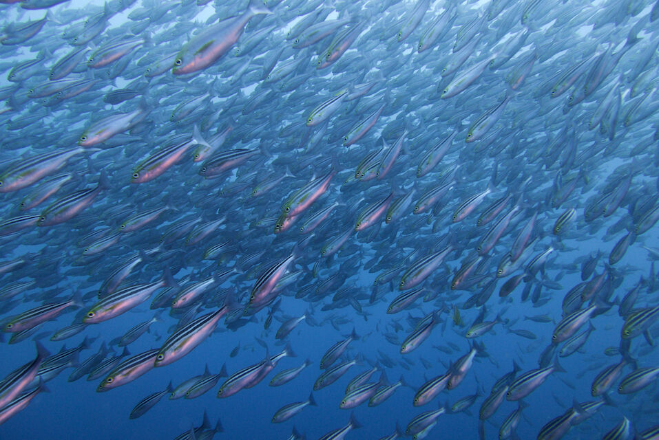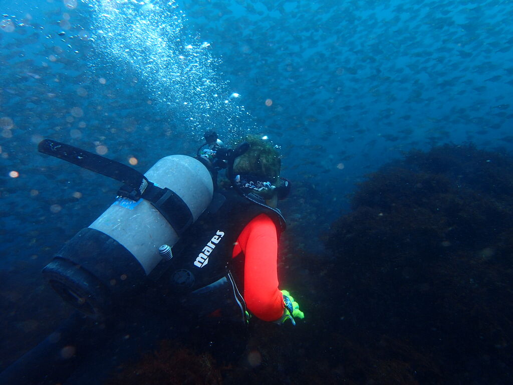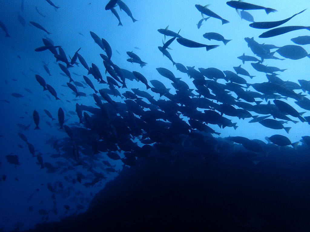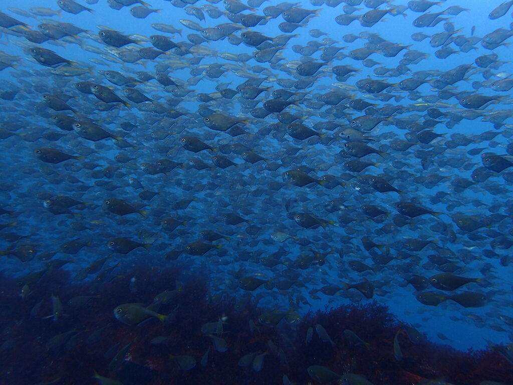 沖へ出ていくとイサキの群れが見え始め、タカベの群れも。
