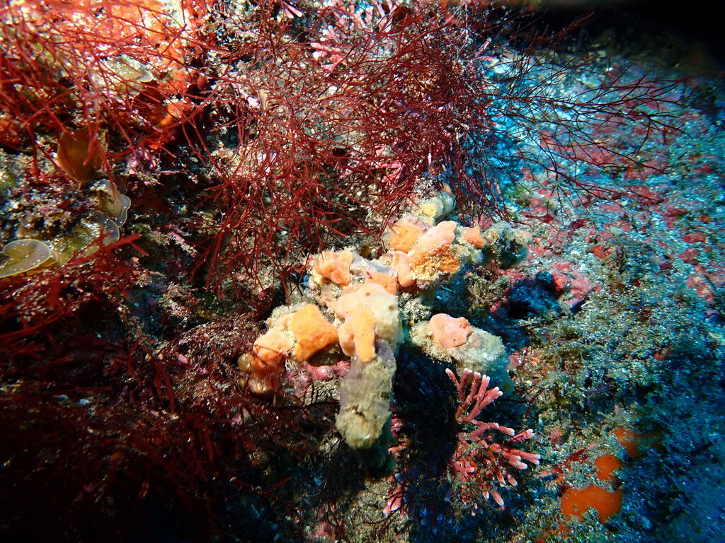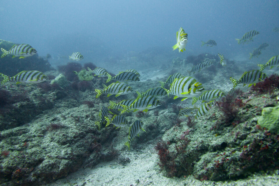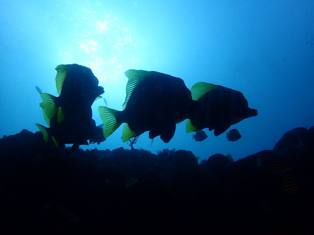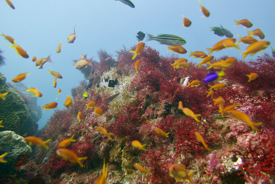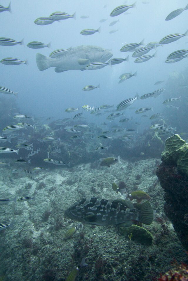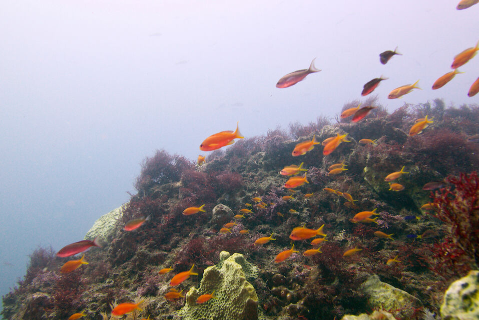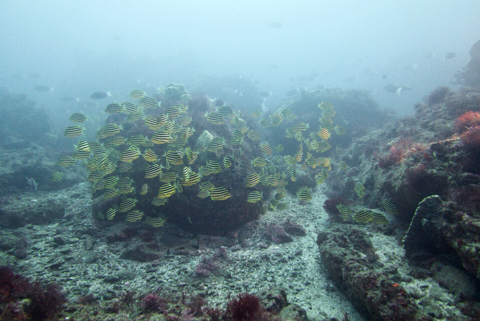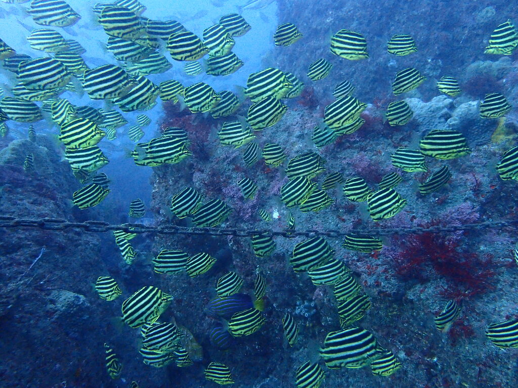 根の亀裂には、タテジマキンチャクダイの幼魚。キンギョハナダイとカシワハナダイの群れ。