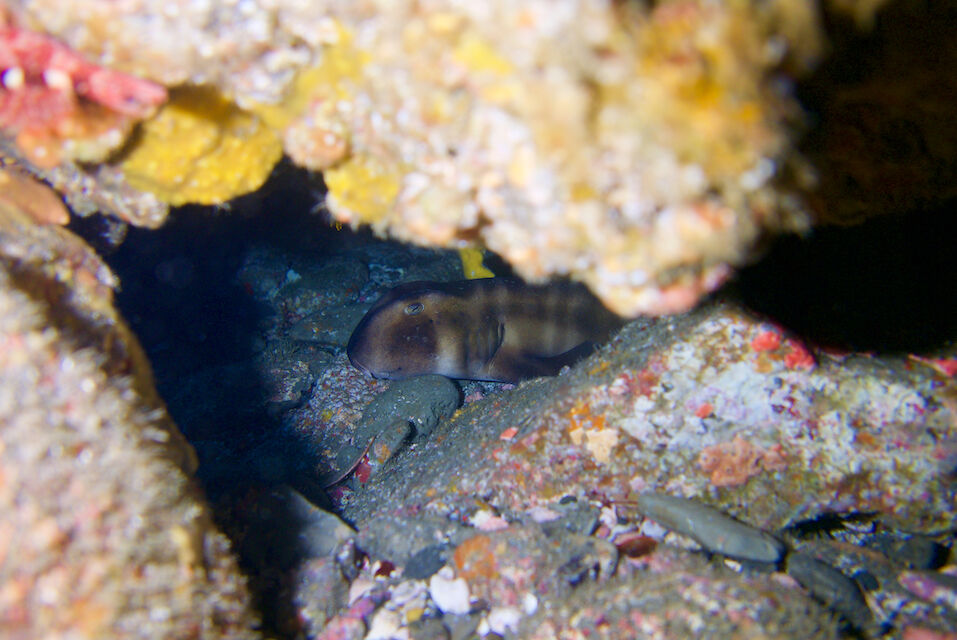 岩のテングダイが並んでいて下には小さめなネコザメ。