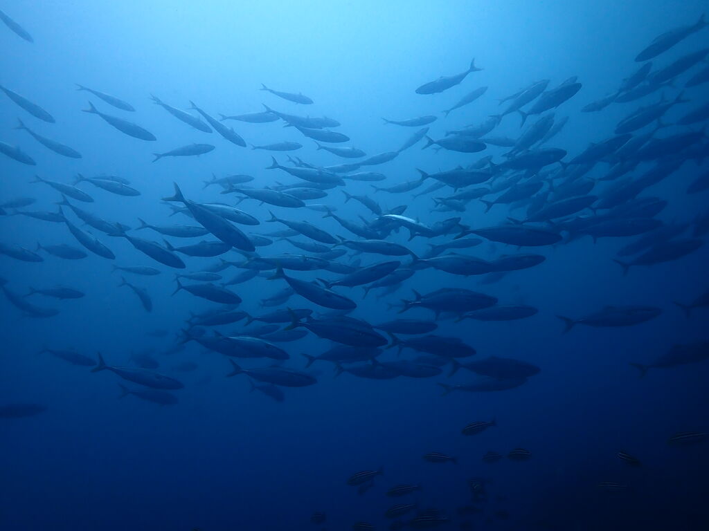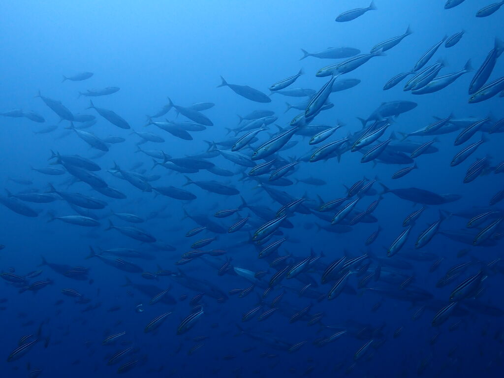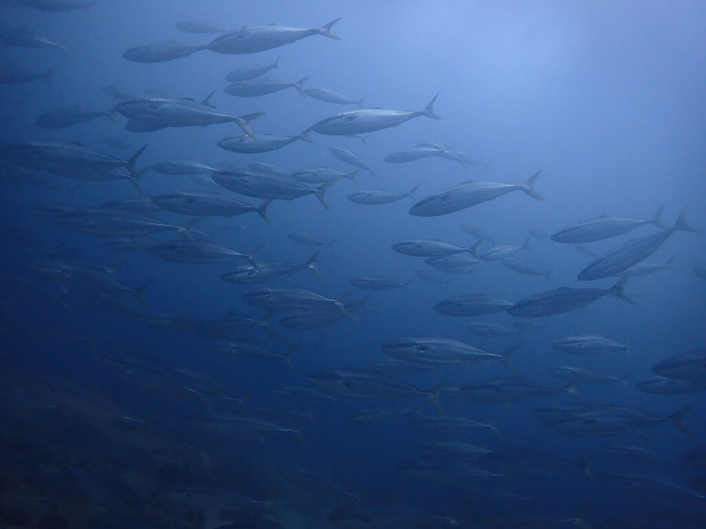 ヒレナガカンパチが必死にタカベの群れにアタックしていました。