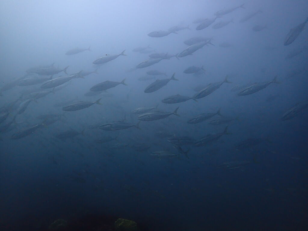 沖ではワラサの群れ。視界悪いのでぼんやりです。
