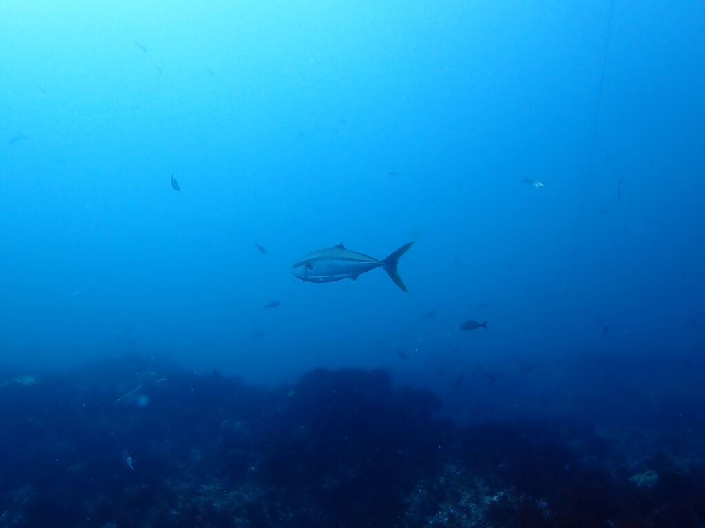 頭上にはイサキの群れ。 さらに上を見てみると、オキザヨリの群れが泳いでいました。
