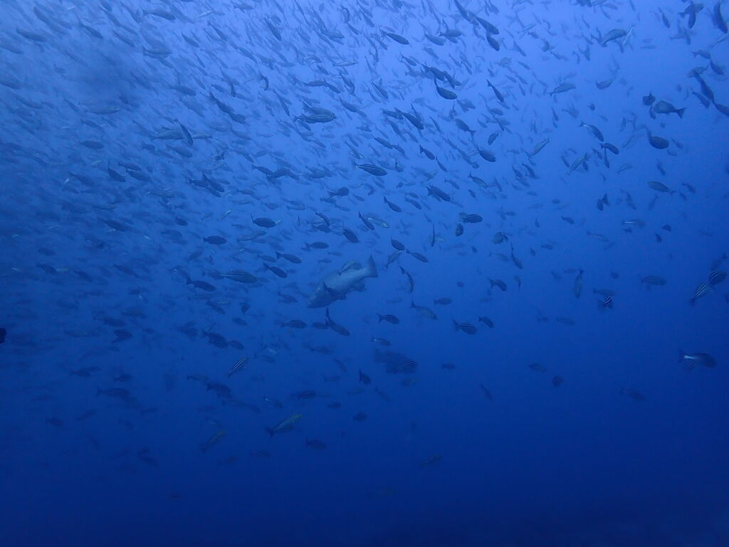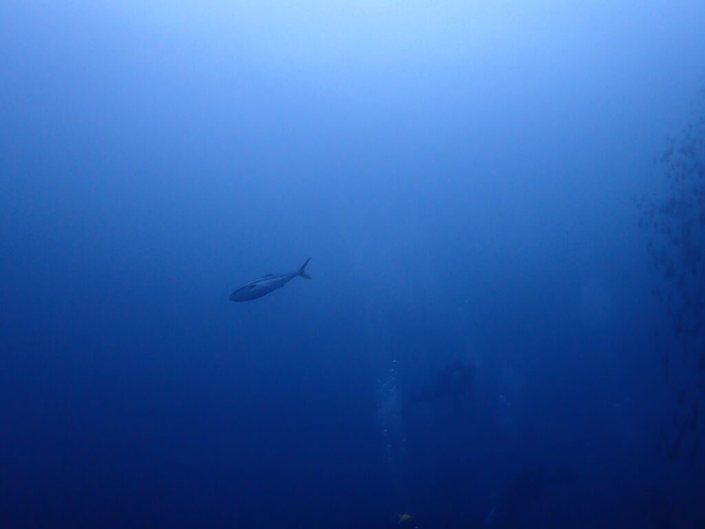 視界は白っぽいですがイサキの玉が大きなヒラマサ数匹に追われています。