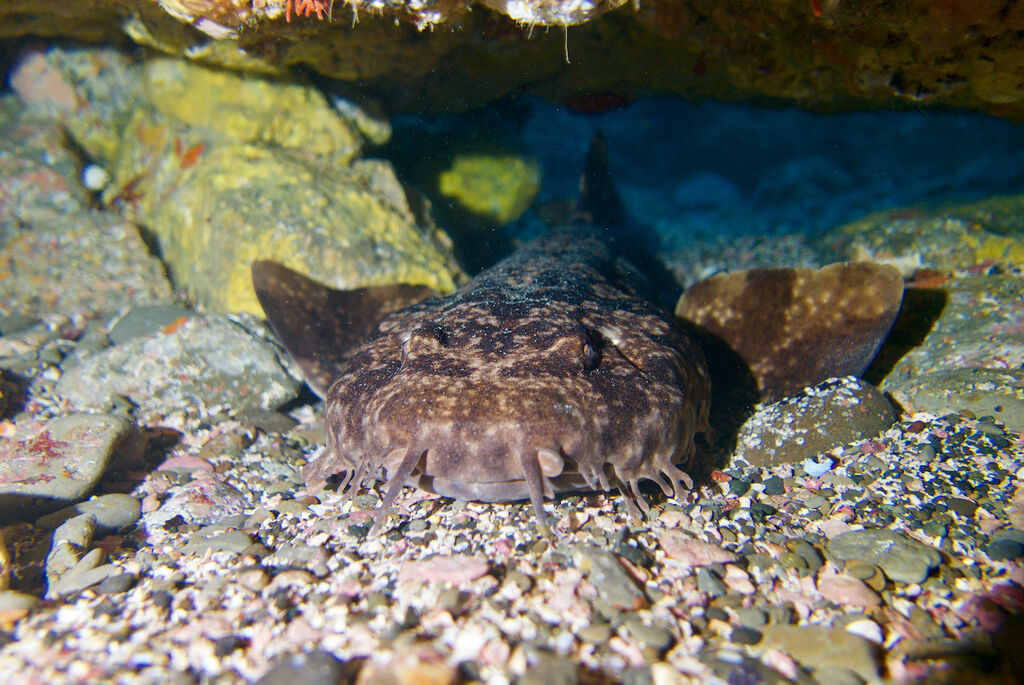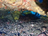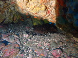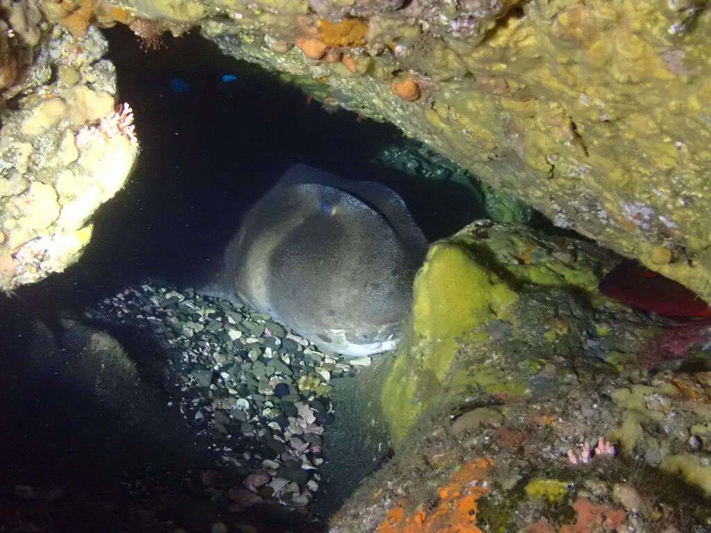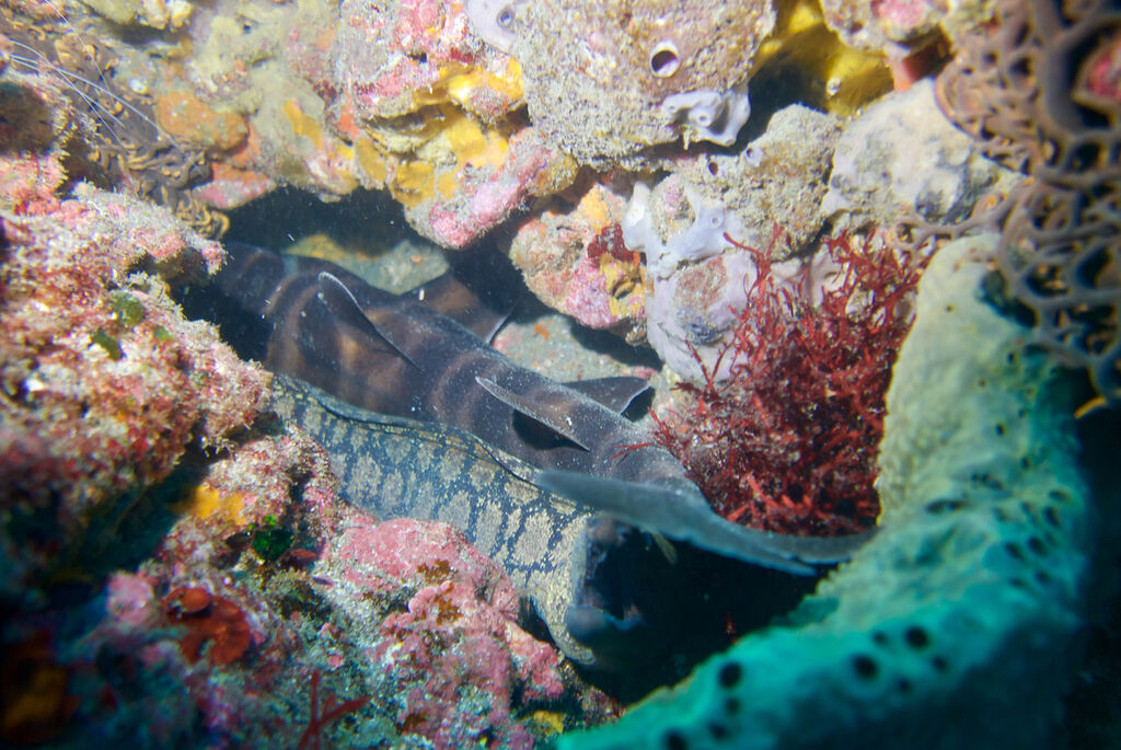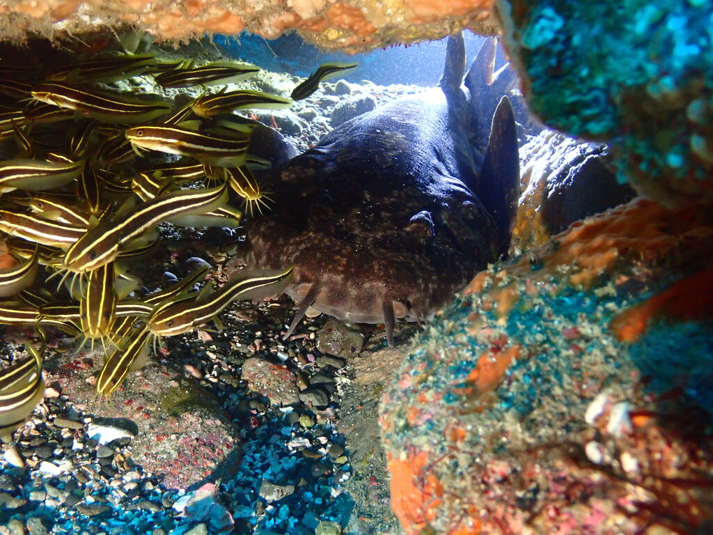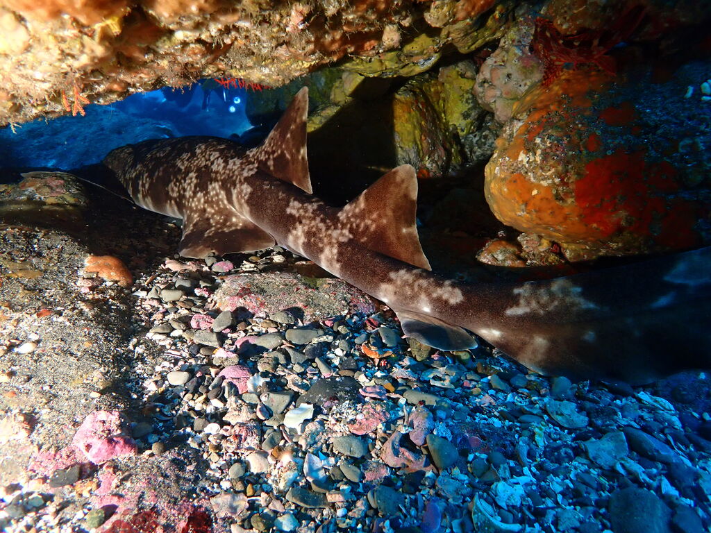 根の亀裂には小さめなオスのネコザメがウツボと一緒に入っています。