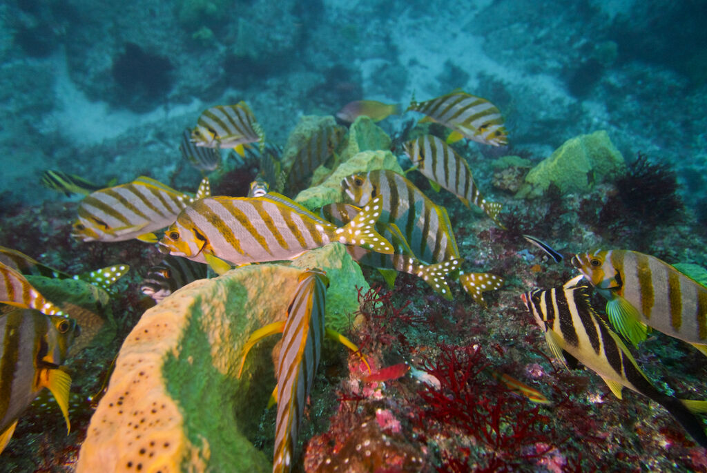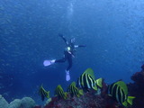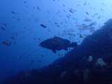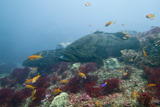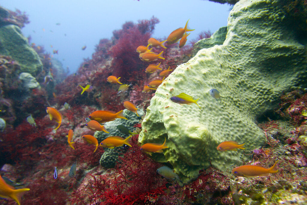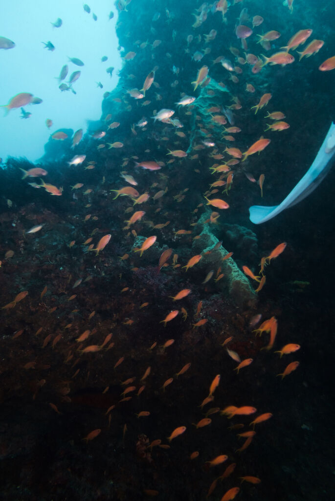 潮の当たる南側にはキンギョハナダイの群れ、カシワハナダイ。