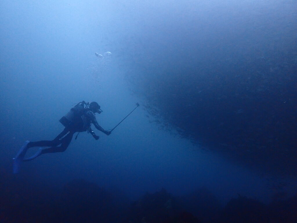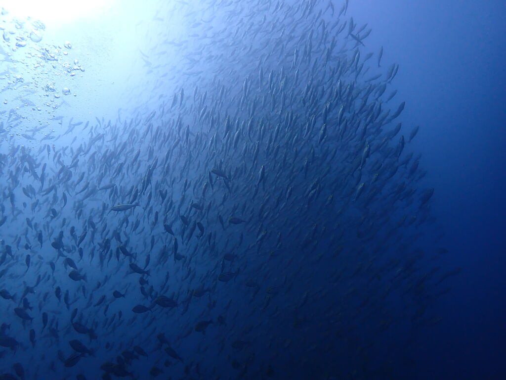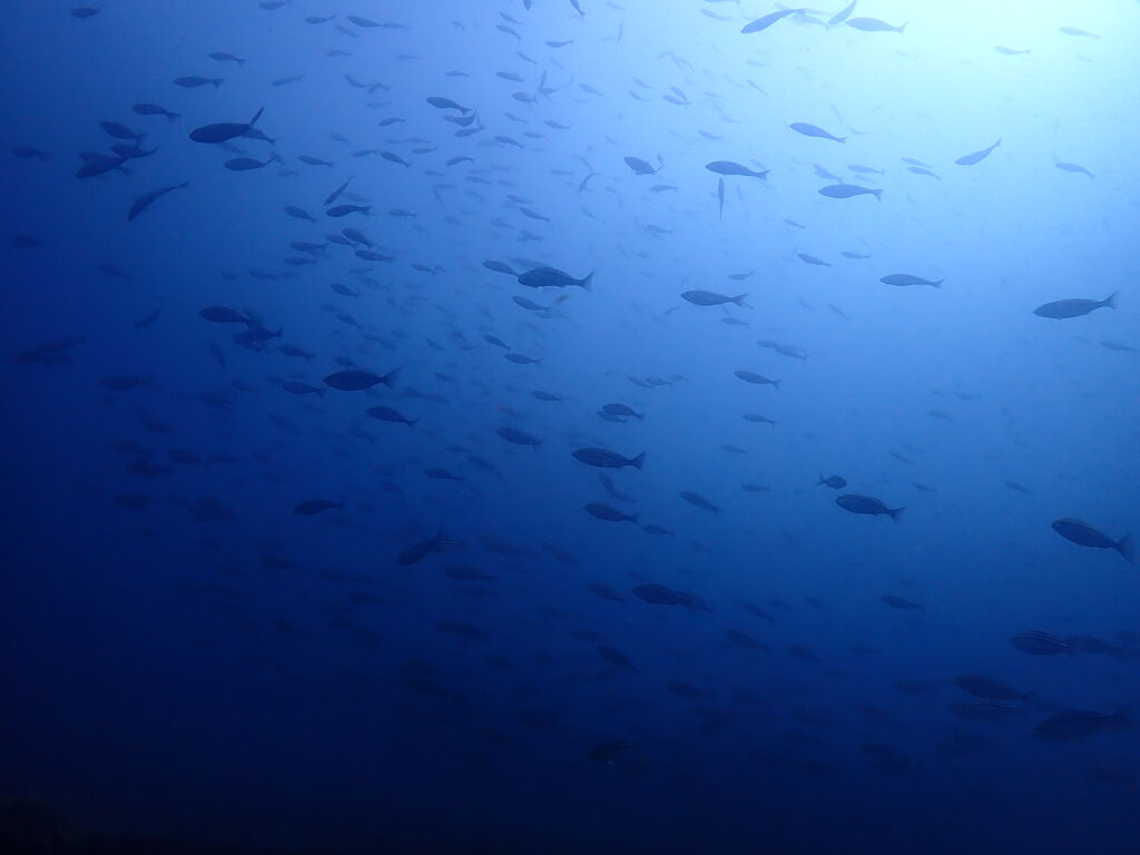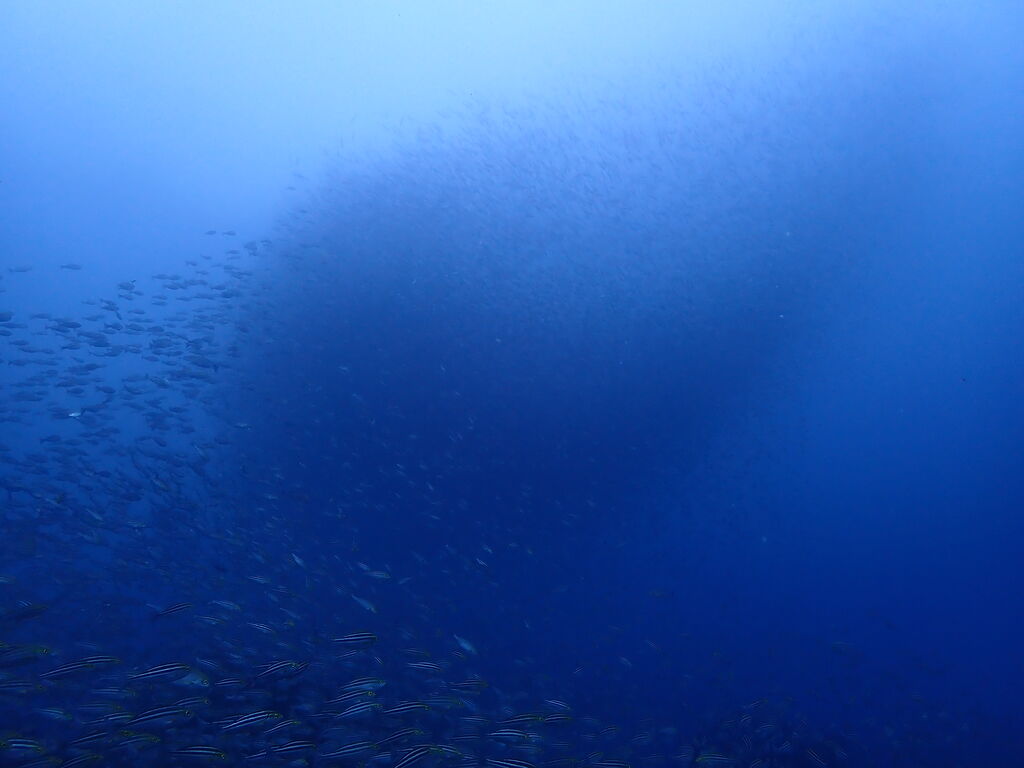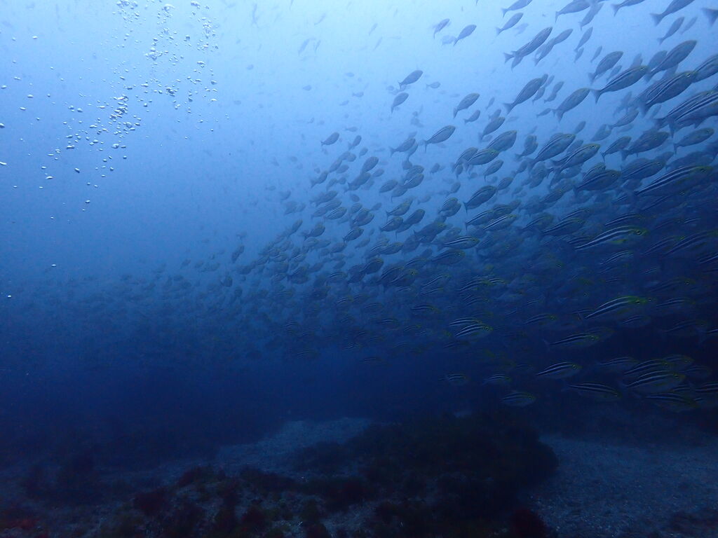 沖に出ていくと真っ黒な塊が見えてきて、近づいていくとイサキの大群でした!