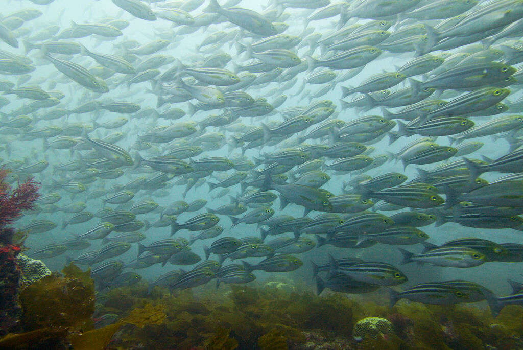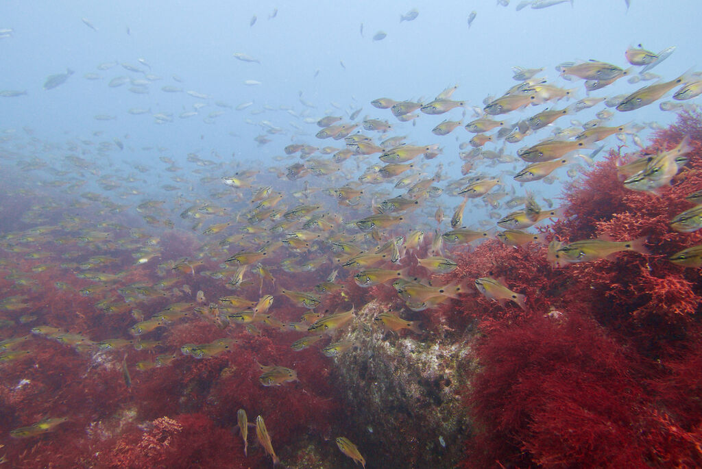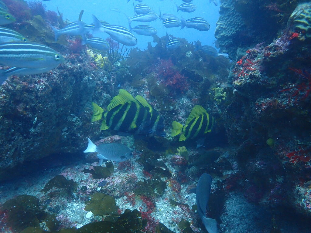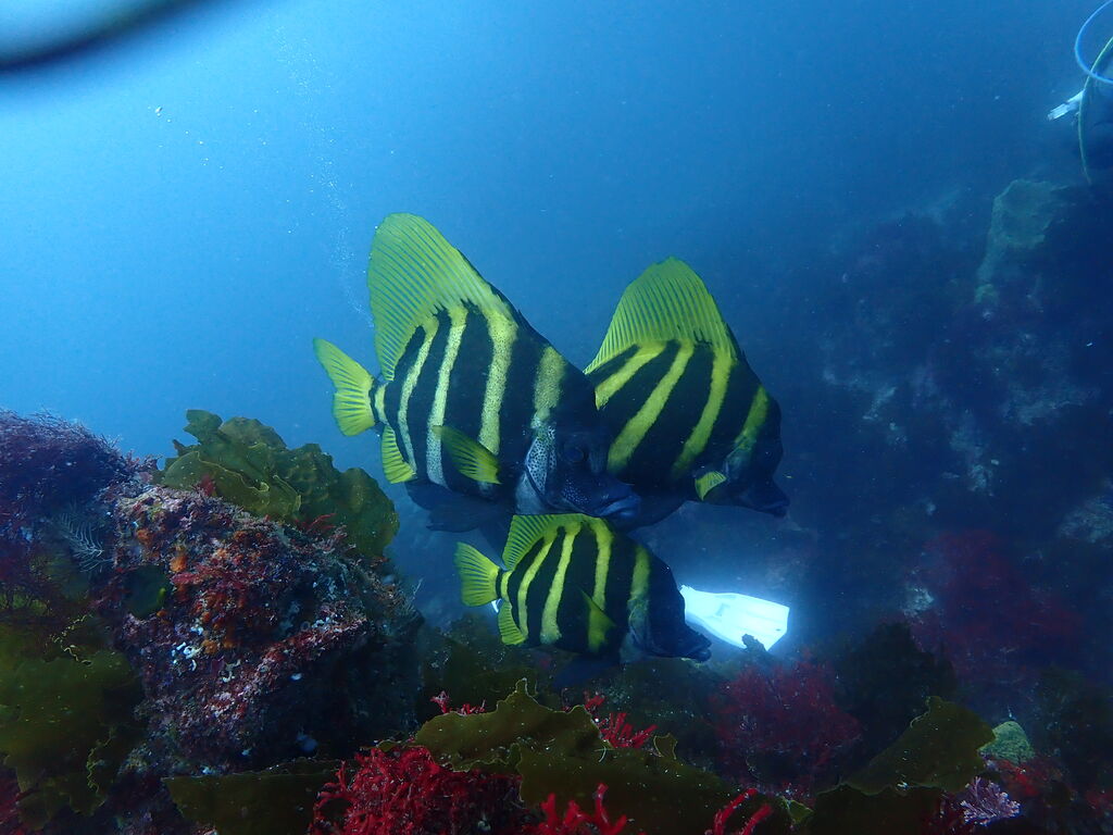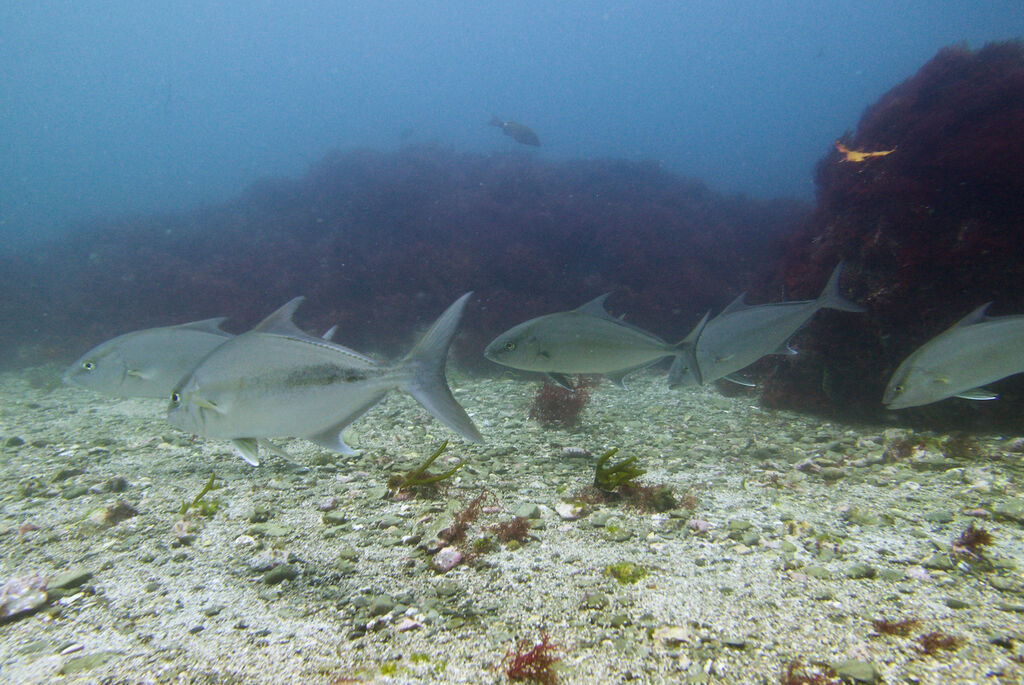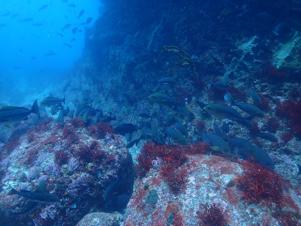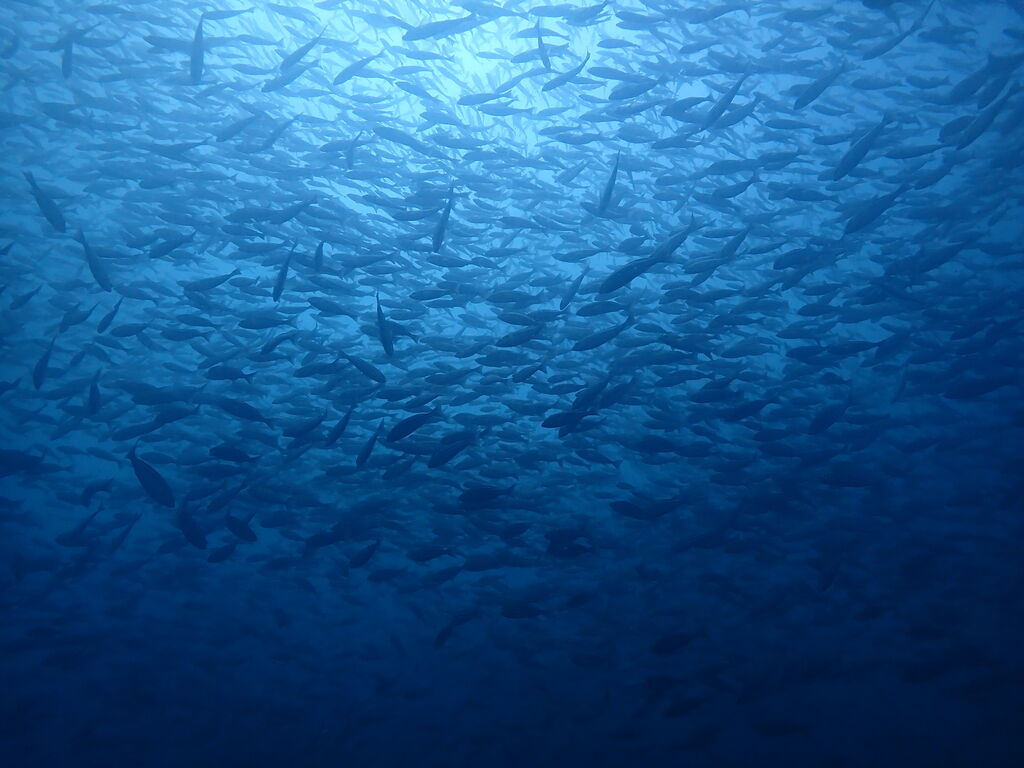 <タカベの子をヒレナガカンパチの子が追っていました。>