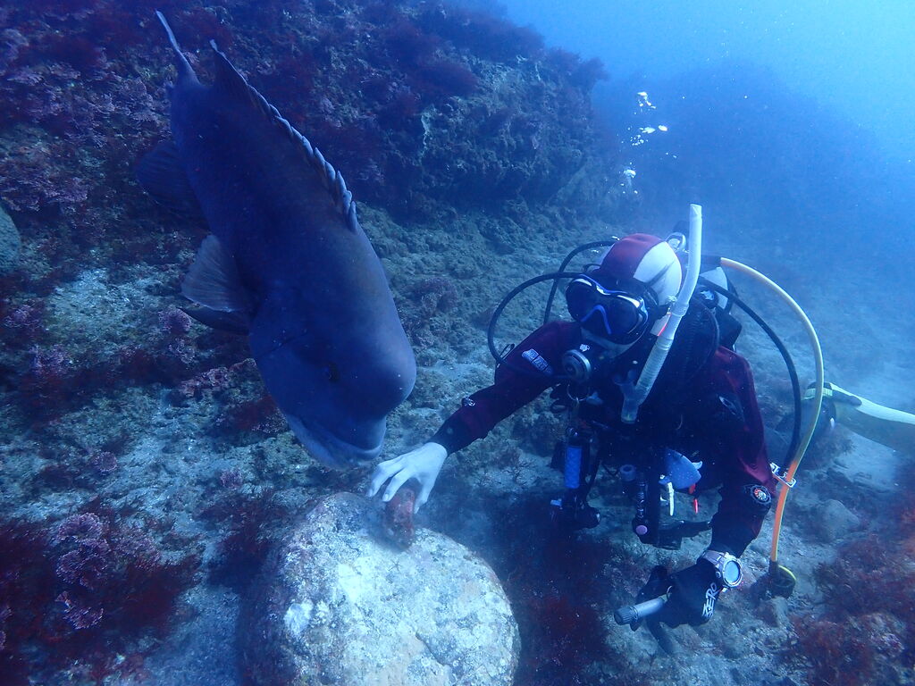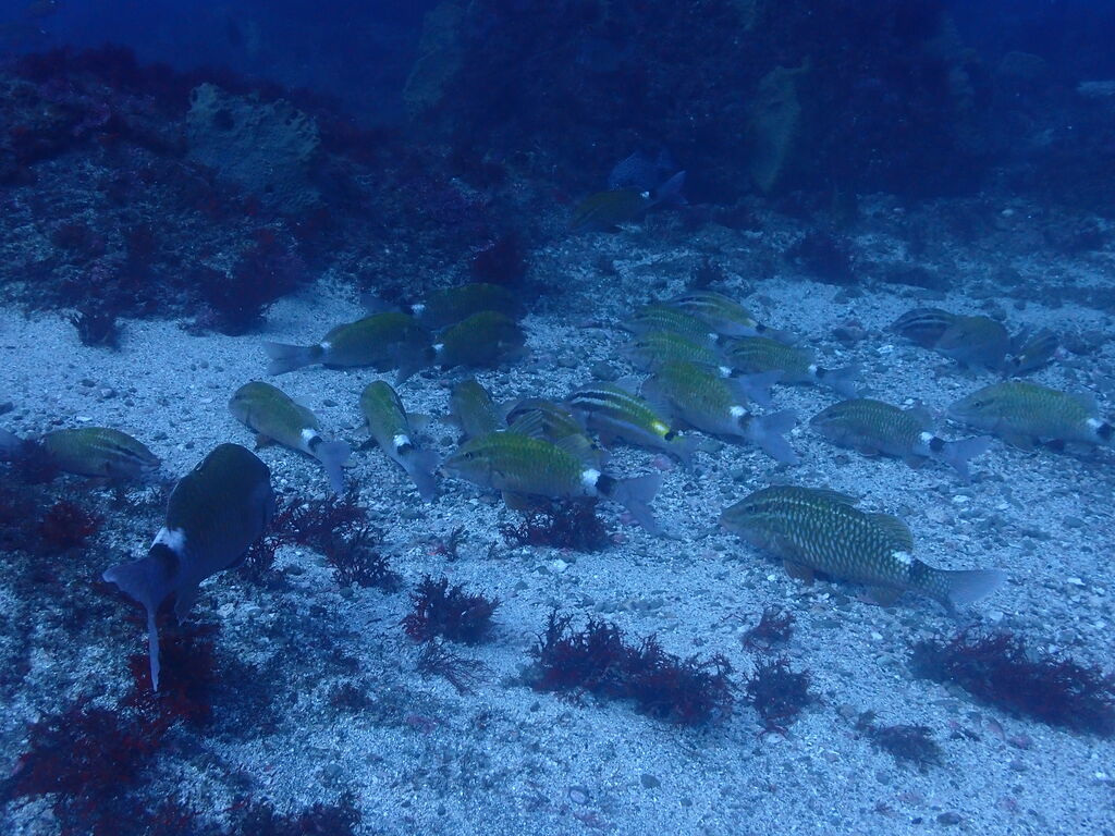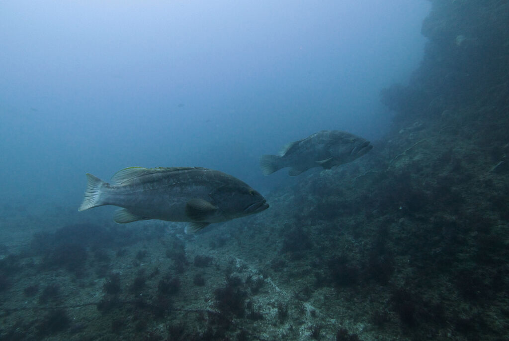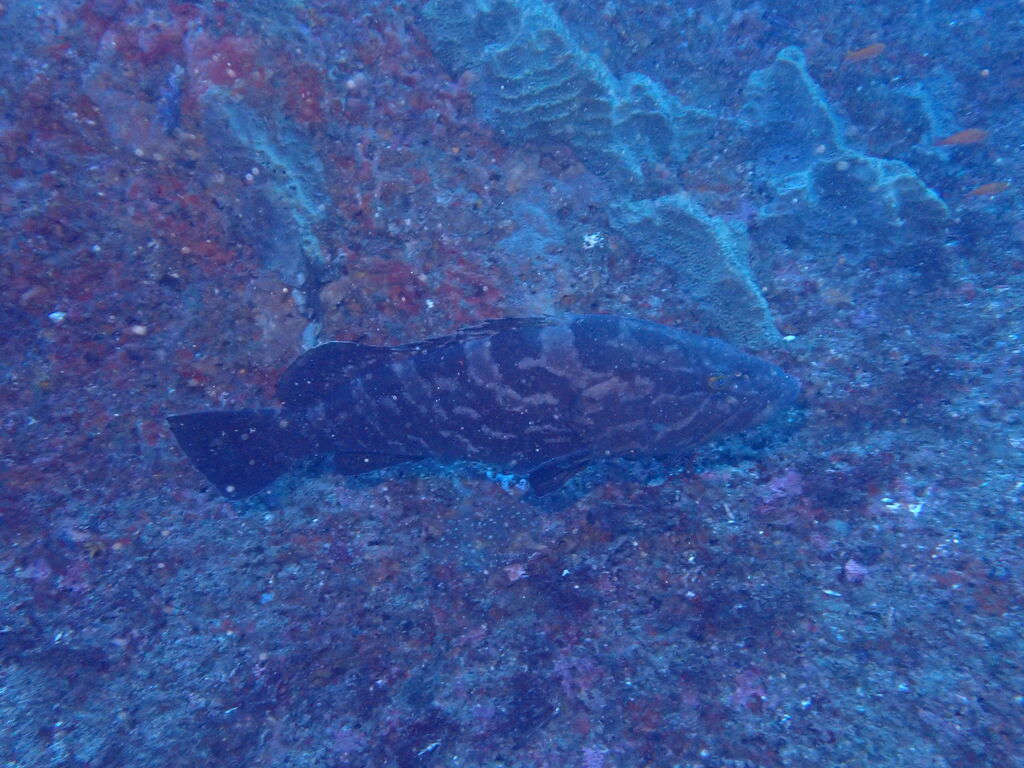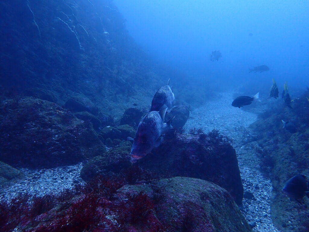 岩陰にクエが2匹☆ 沖にはうっすらイサキが群れていました!