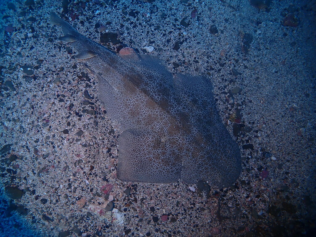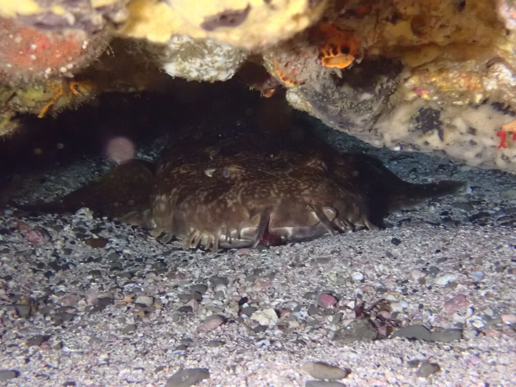 <水底にネコザメ、近寄って見てみると大きなサザエを咥えていました。>