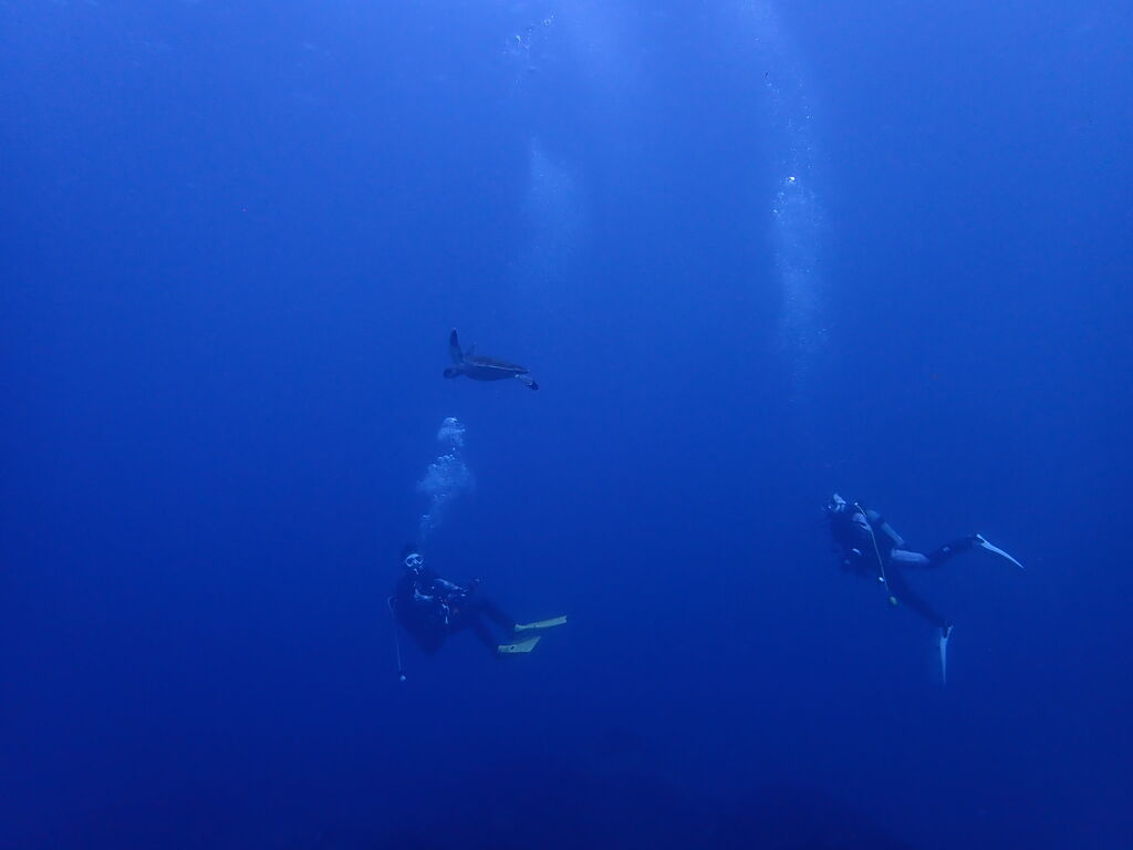 沖に出ていくと水底に大きなヒラメ。 大きなアオウミガメも泳いでいました。
