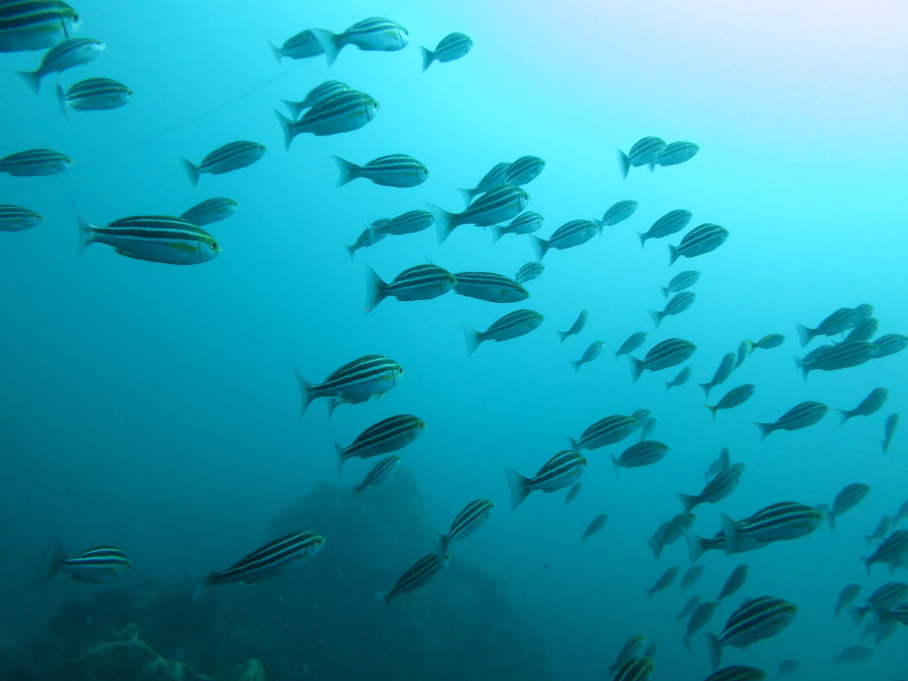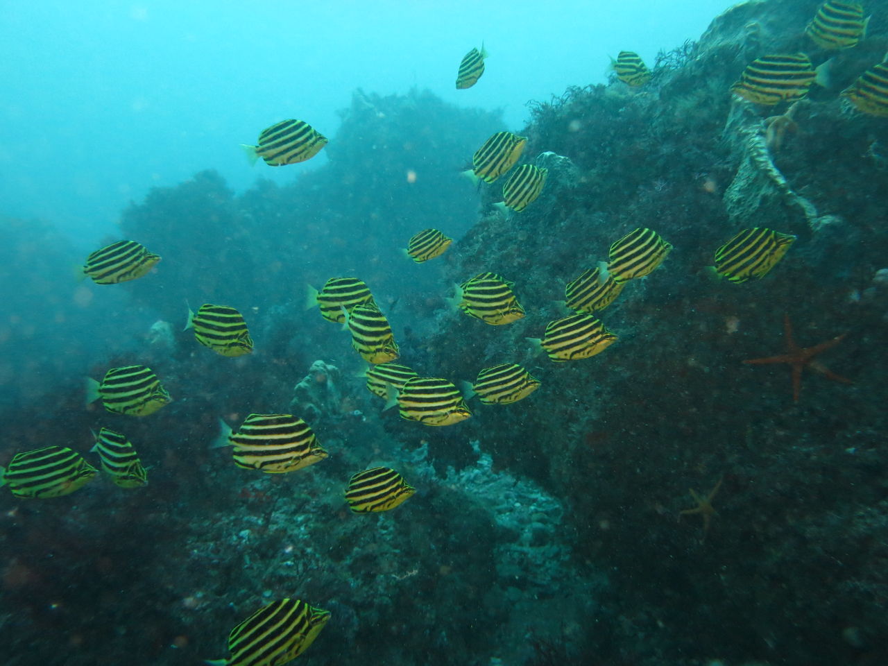 おぉ〜☆なかなか綺麗ですよぉ!!10〜15mぐらいの透明度です。サメ穴には綺麗なキンギョハナダイがたくさん群れてます。メバルはちょっと斜め上を向いてむれていますね。ネコサメも二匹ほど穴の中で休んでいましたカゴカキダダイやテングダイは色が派手なのです分かりますよ