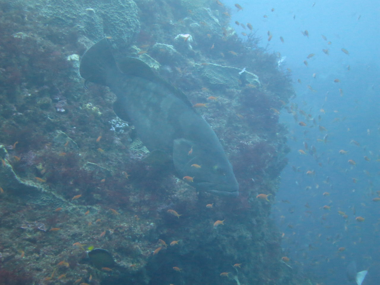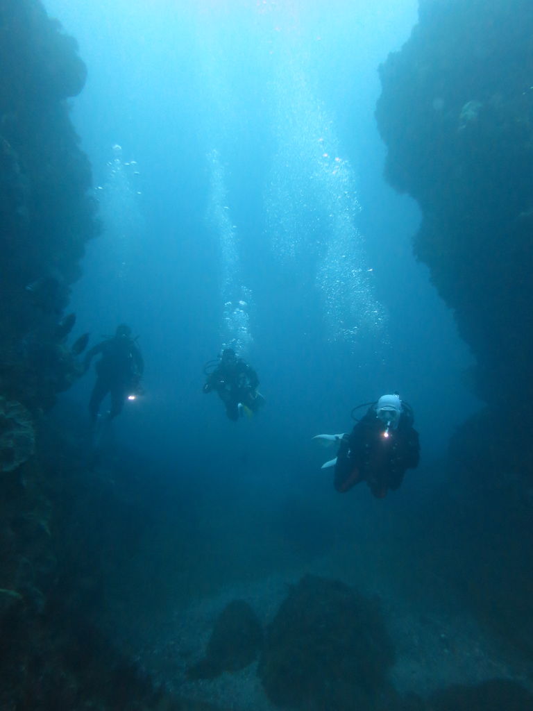 西ノ山の横のに大きいなモロコさんが二匹泳いでいました。今日もあのかわいらしいハナタツクンがいましたよ♪大きなイシガキフグもいました、しかも2匹でした。離れ根の上にメジナがいっぱい泳いでいます☆ V字谷にはヒゲダイが15匹以上中層にいました、今日はほとんど流れが無かったけし谷と谷の間がすけてみえてて海が綺麗の証拠ですね