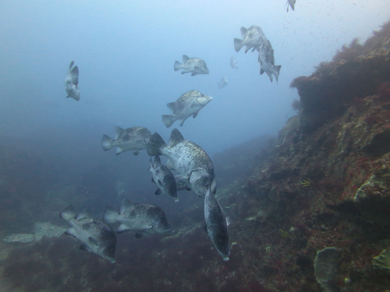 エントリーしてみると、水が青く、流れもほとんど無く、ゆったりと移動できます。まずトビエイの根にまわって、そしてサメ穴で遊んでいました、タカノハダイが30匹くらい水底に張り付いていました☆ 岩の上にはメバルがたくさん☆ ネンブツダイやカゴカキダイもたくさん泳いでいますよ♪最近サメ穴の岩の上でみんな集まっていますね、逃げないで本当に可愛らしく、見てて満足します。