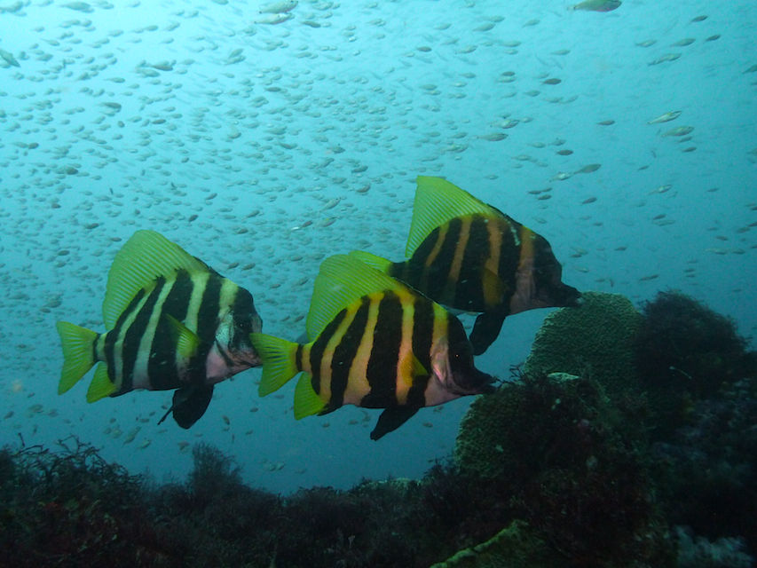 トビエイ休憩所の岩には大きなモロコが1匹。そこからサメ穴にかけてはイサキの大群。かなりの数です。