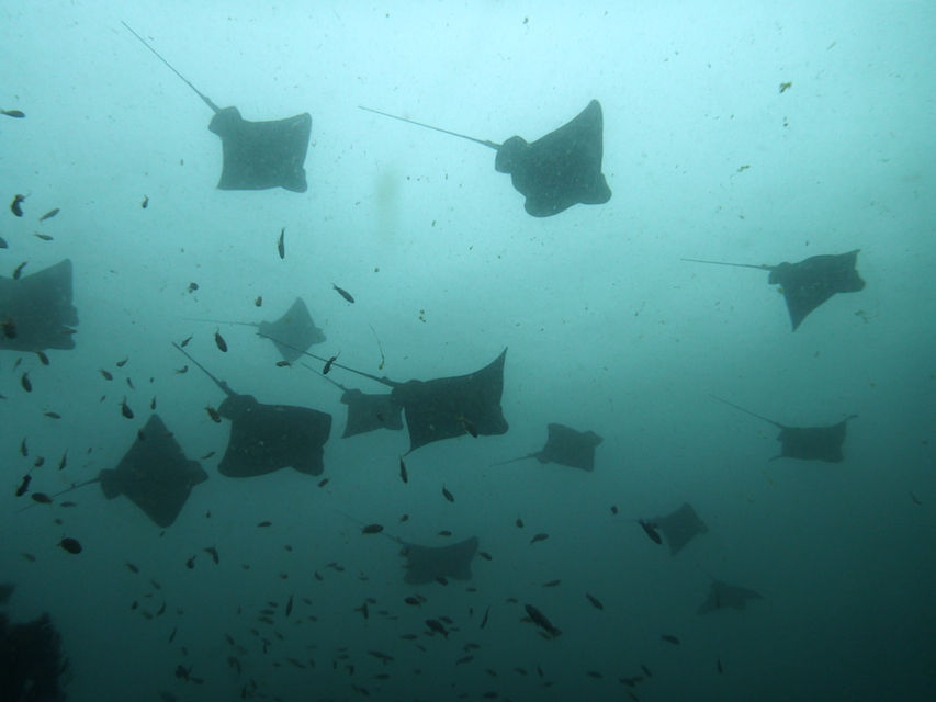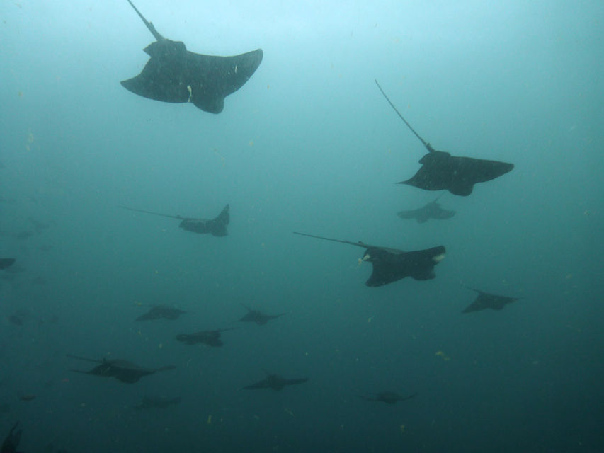 トビエイの根はメジナの群れ、その少し先にトビエイの群れが見え始めました。結構います。20〜30枚は見えていますがその先が霞んで見えません。