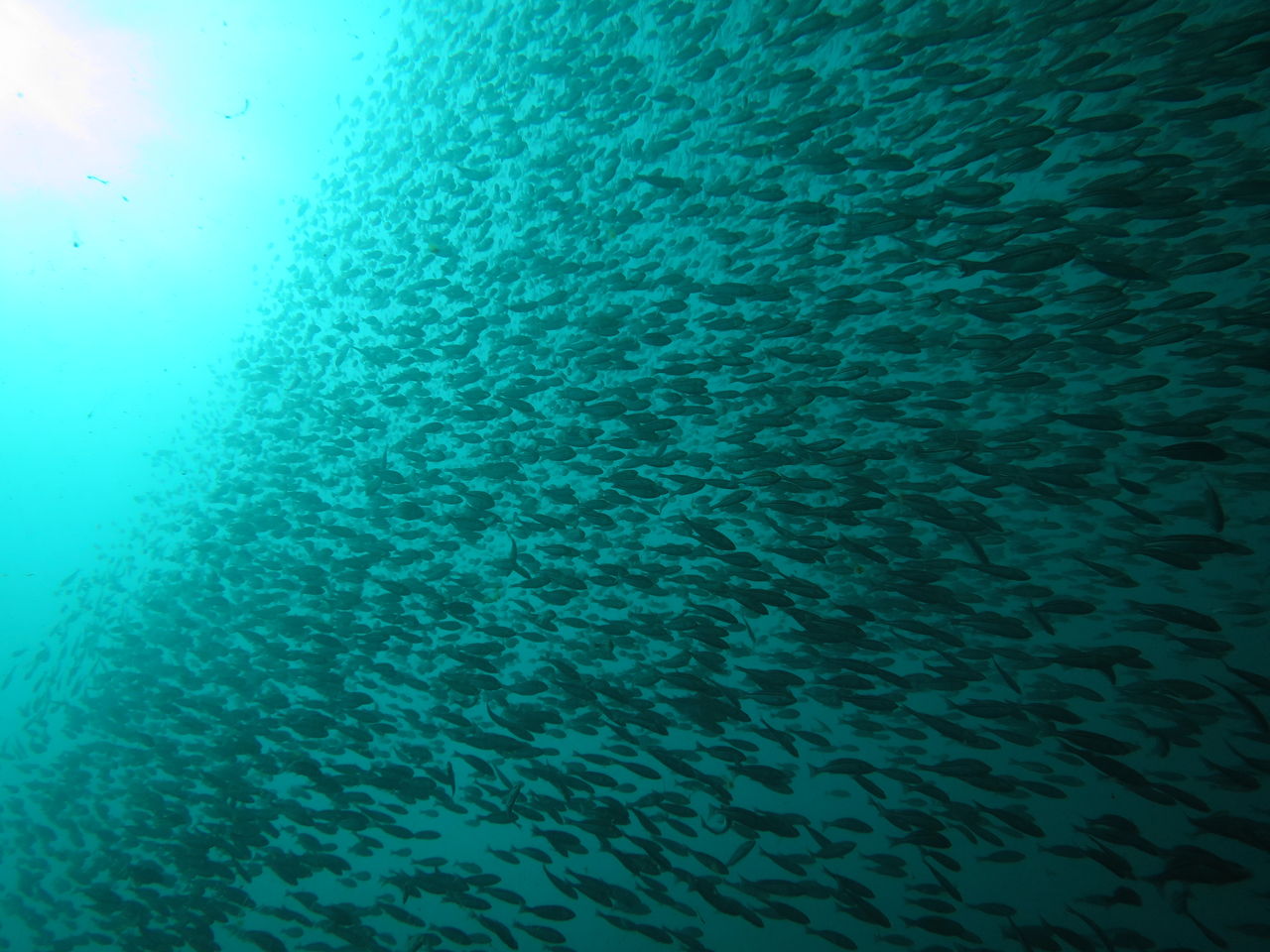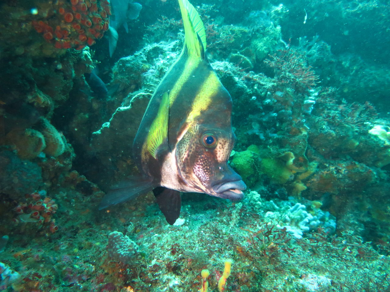 Aポイントからエントリー。 ほぼ潮止まりなのでもう一度北へ。トビエイの根に着くと15匹ほどのイナダの群れが泳いできましたが、すぐにモロコ岩方面に消えていきました。その後Cブイを経由してV字谷へ、根の上はイサキ天国!! 何十万匹いるんでしょうね??イサキが上を泳いでいると水中が暗くなるぐらいです。西ノ山の裏にはテングダイが一匹泳いでいました。