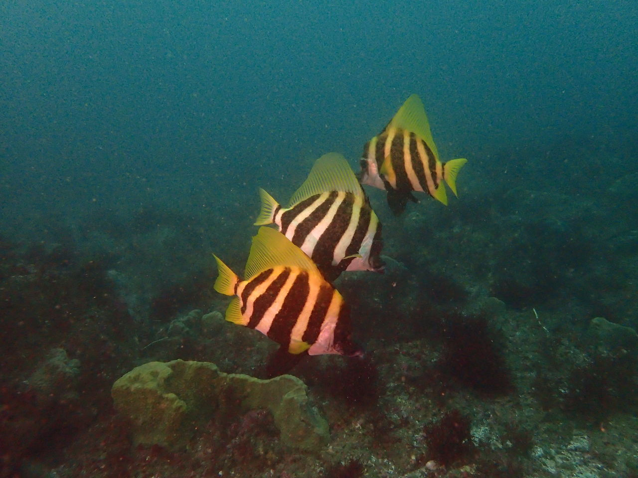 先ずはアナゴ岩へ、トゲチョウチョウウオの幼魚が一匹ヒラヒラ泳いでいました。 テング岩にはイサキとメジナの群れが凄いです!