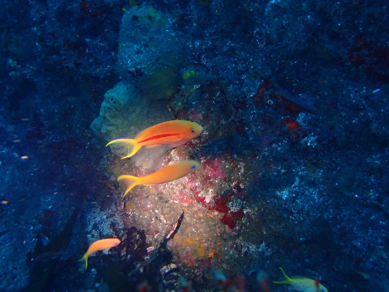 更に西へ出て行くと中層にイサキの大群☆ テング岩にはキンギョハナダイの群れとスジハナダイが泳ぎ回っています。