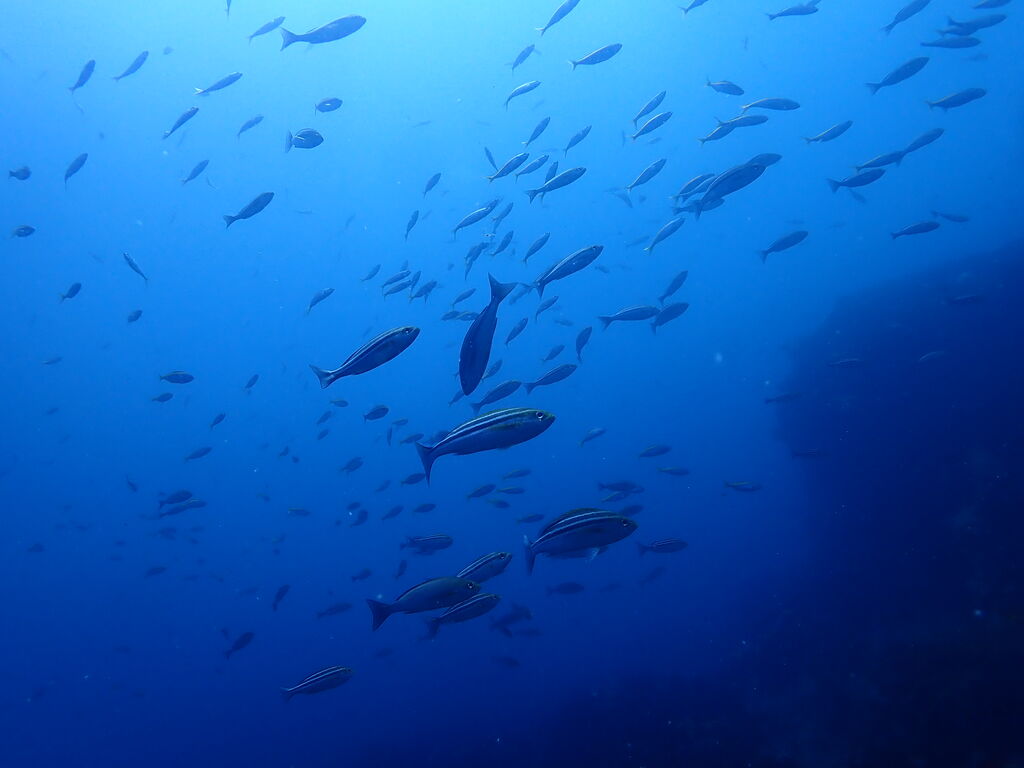 V字谷の南側にはイサキやタカベが群れ群れ。