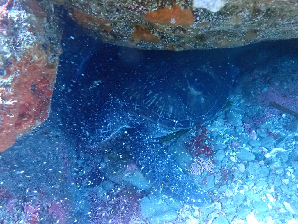<アオウミガメが岩の下から出てきました。>