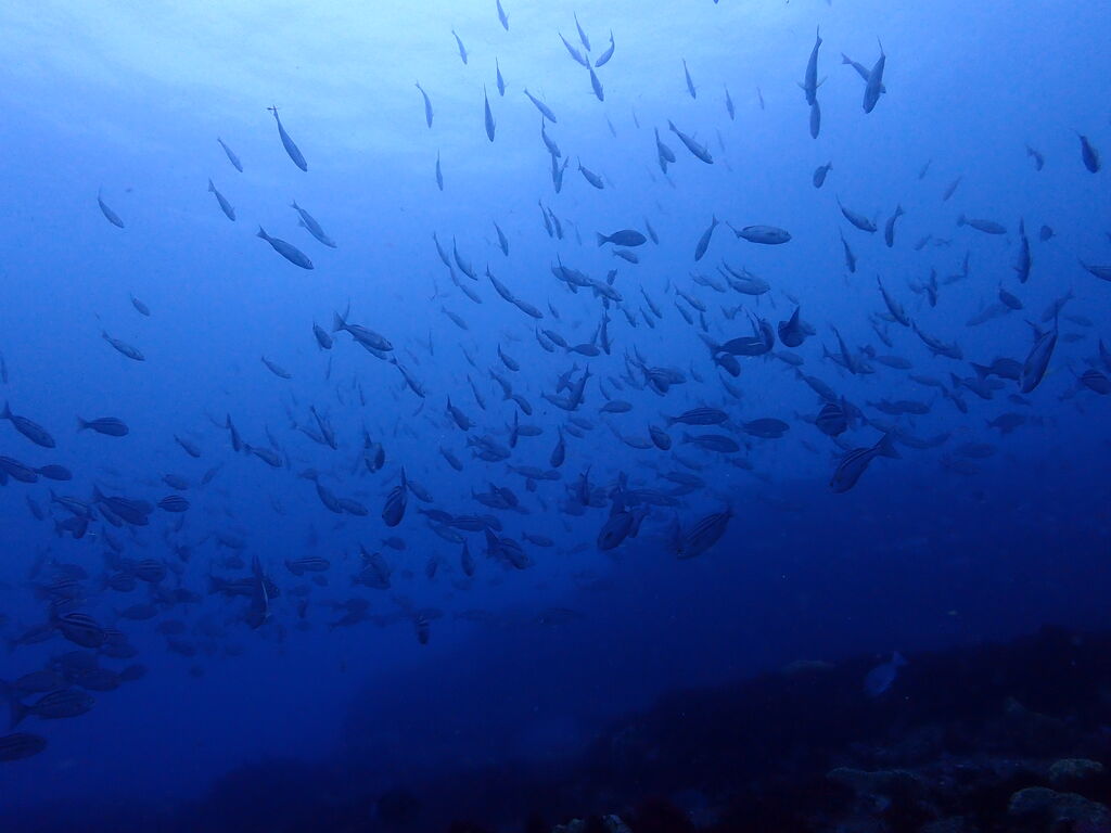 イサキの群れ! トビエイの根には小さなネコザメ。