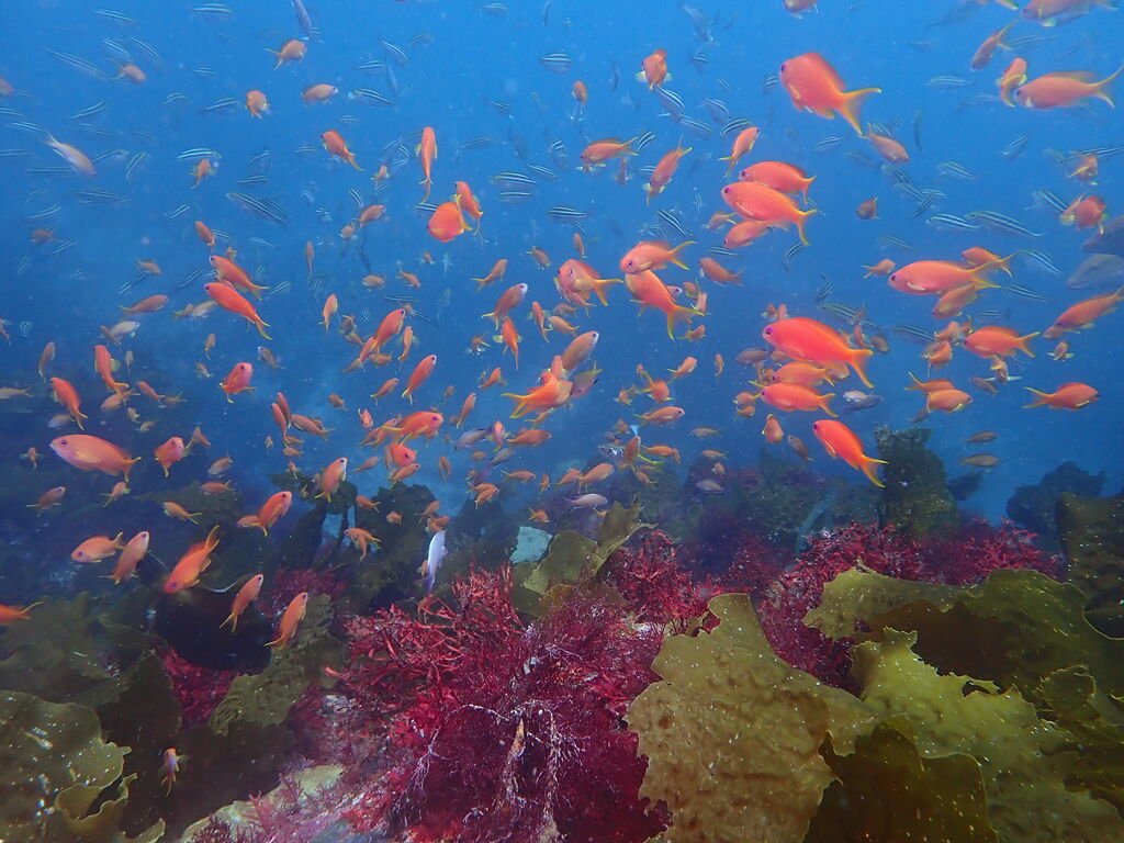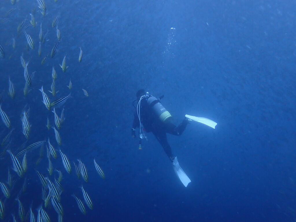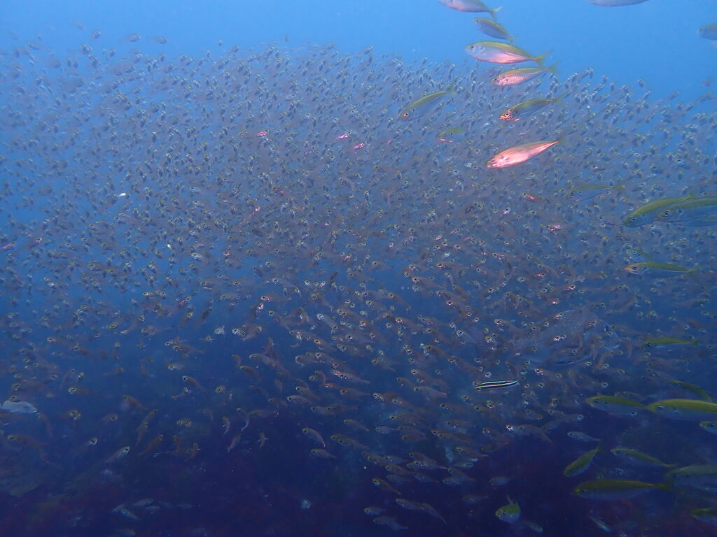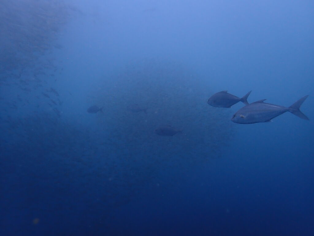 V字谷はホウライヒメジでいっぱい。 タカベの群れにヒレナガカンパチが6匹捕食に来ていました。
