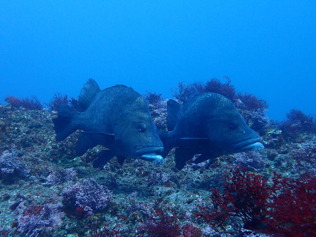<イサキの群れの向こうをヒラスズキがこっそり通っていました。>