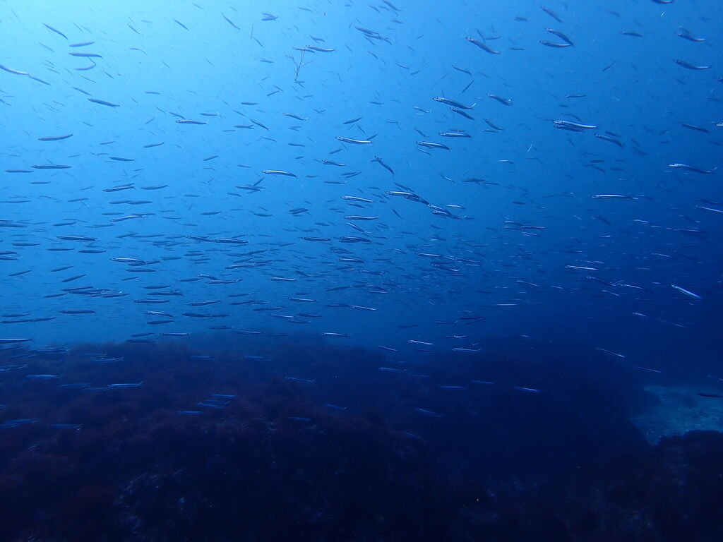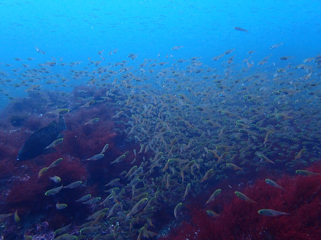 キンメモドキやキビナゴの群れで漁礁エリアは溢れかえっています。
