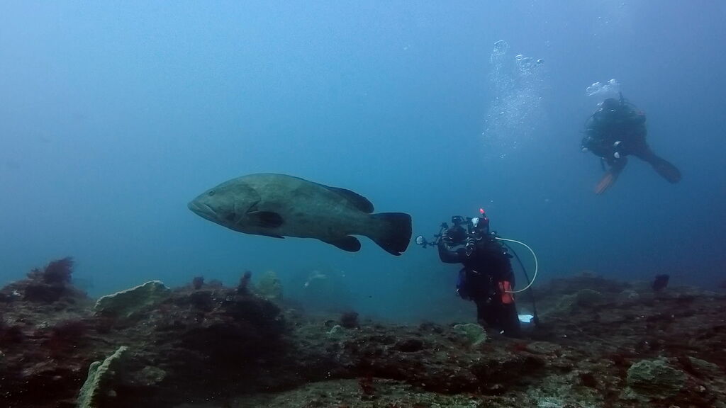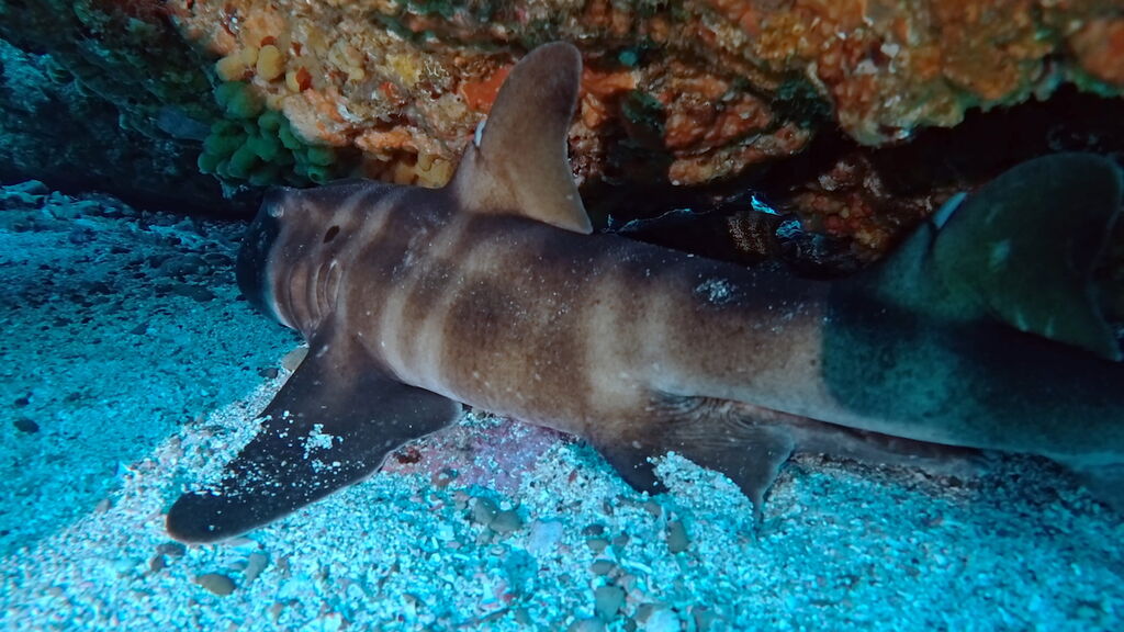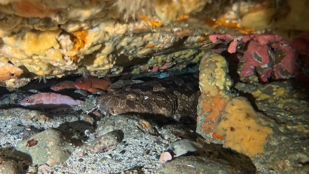 モロコ岩のオオモンカエルアンコウ、岩の下、奥にネコザメ。